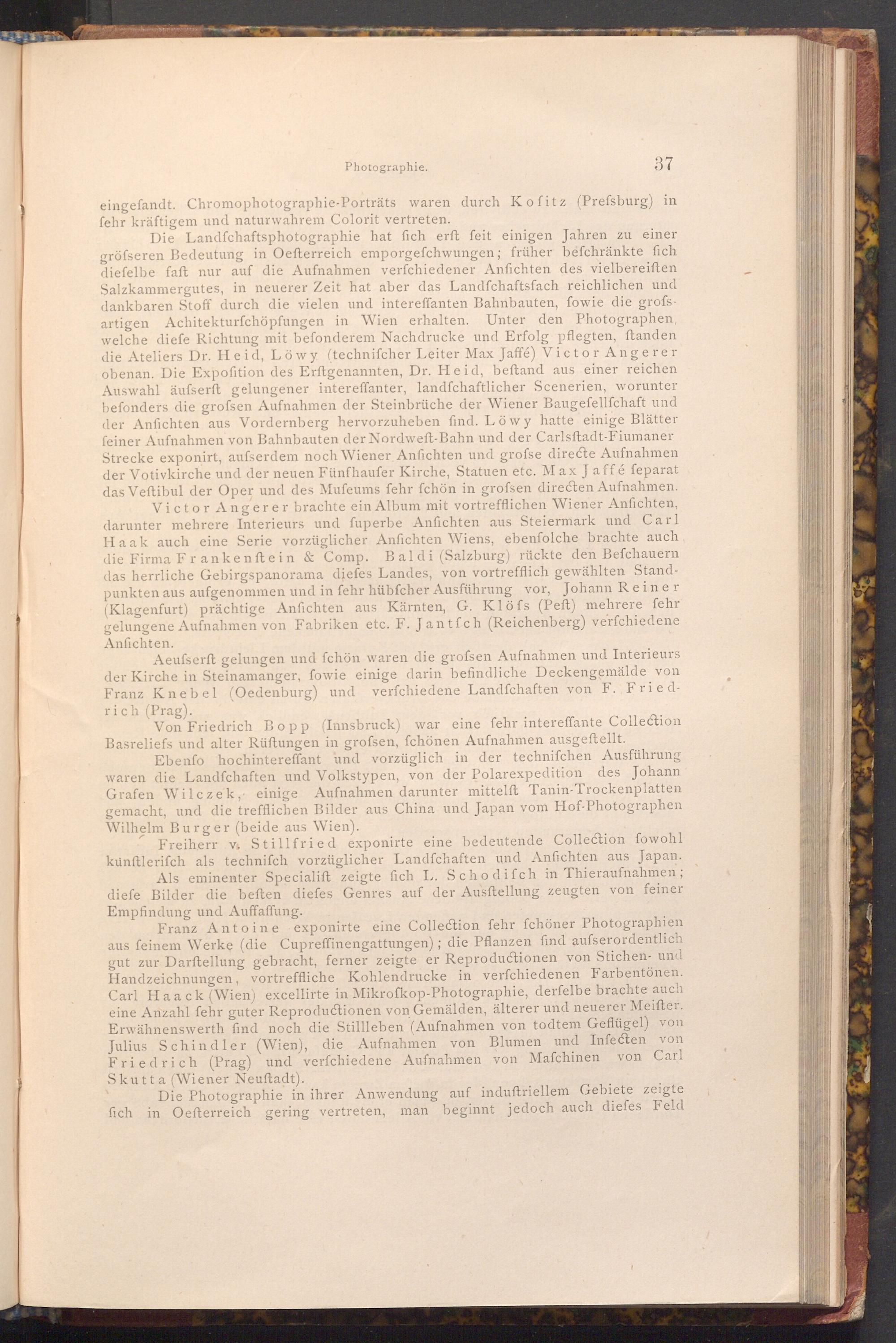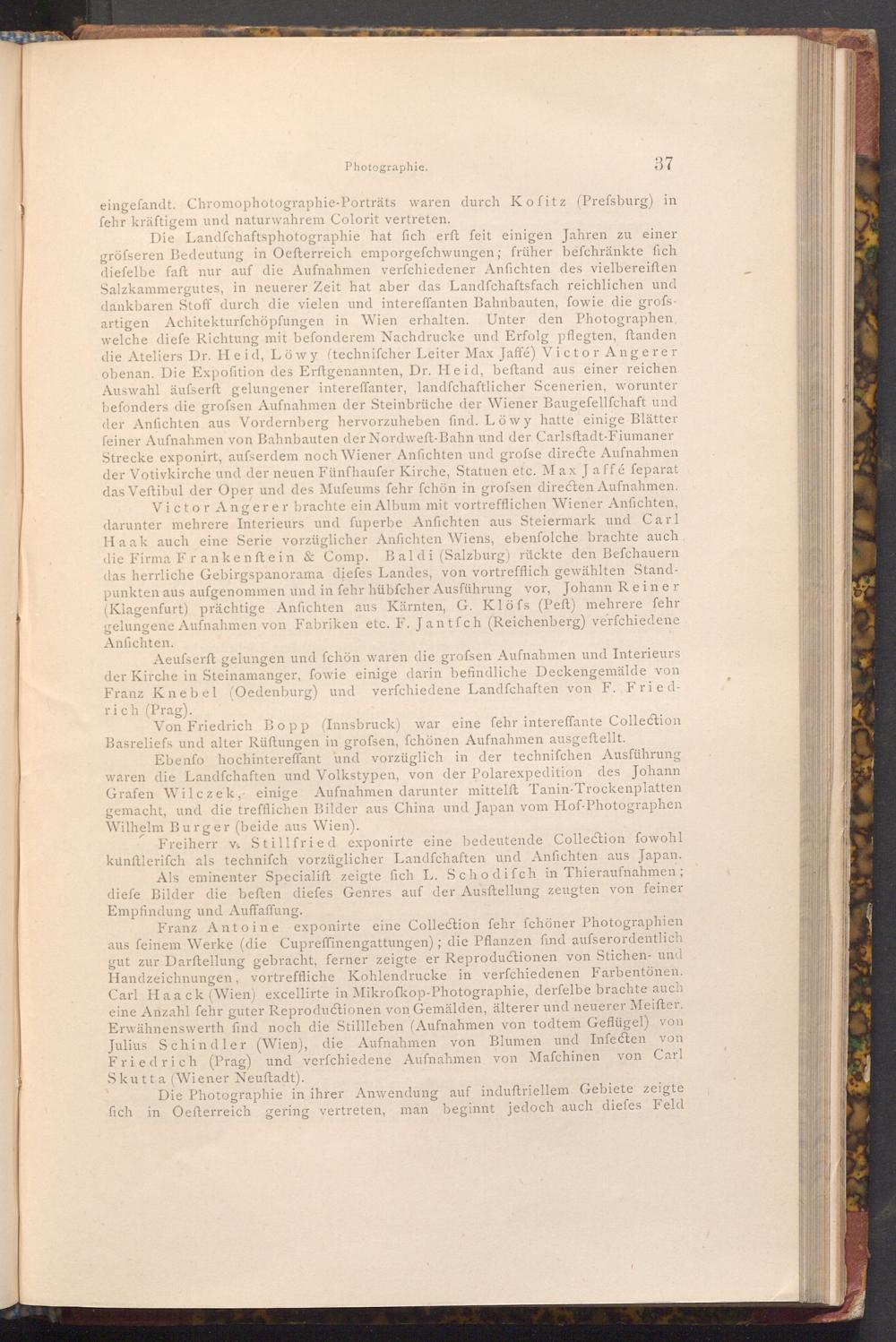 Die Landfchaftsphotographie hat fich erft feit einigen Jahren zu einer gröfseren Bedeutung in Oefterreich emporgefchwungen; früher befchränkte fich diefelbe faft nur auf die Aufnahmen verfchiedener Anfichten des vielbereiften Salzkammergutes, in neuerer Zeit hat aber das Landfchaftsfach reichlichen und dankbaren Stoff durch die vielen und intereffanten Bahnbauten, fowie die grofsartigen Achitekturfchöpfungen in Wien erhalten. Unter den Photographen, welche diefe Richtung mit befonderem Nachdrucke und Erfolg pflegten, ftanden die Ateliers Dr. Heid, Löwy( technifcher Leiter Max Jaffé) Victor Angerer obenan. Die Expofition des Erftgenannten, Dr. Heid, beftand aus einer reichen Auswahl äufserft gelungener intereffanter, landfchaftlicher Scenerien, worunter befonders die grofsen Aufnahmen der Steinbrüche der Wiener Baugefellſchaft und der Anfichten aus Vordernberg hervorzuheben find. Löwy hatte einige Blätter feiner Aufnahmen von Bahnbauten der Nordweft- Bahn und der Carlsftadt- Fiumaner Strecke exponirt, aufserdem noch Wiener Anfichten und grofse directe Aufnahmen der Votivkirche und der neuen Fünfhaufer Kirche, Statuen etc. Max Jaffé feparat das Veftibul der Oper und des Muſeums fehr fchön in grofsen directen Aufnahmen. Victor Angerer brachte ein Album mit vortrefflichen Wiener Anfichten, darunter mehrere Interieurs und fuperbe Anfichten aus Steiermark und Carl Haak auch eine Serie vorzüglicher Anfichten Wiens, ebenfolche brachte auch die Firma Frankenftein& Comp. Baldi( Salzburg) rückte den Befchauern das herrliche Gebirgspanorama diefes Landes, von vortrefflich gewählten Standpunkten aus aufgenommen und in fehr hübfcher Ausführung vor, Johann Reiner ( Klagenfurt) prächtige Anfichten aus Kärnten, G. Klöfs( Peft) mehrere fehr gelungene Aufnahmen von Fabriken etc. F. Jantfch( Reichenberg) verfchiedene Anfichten.