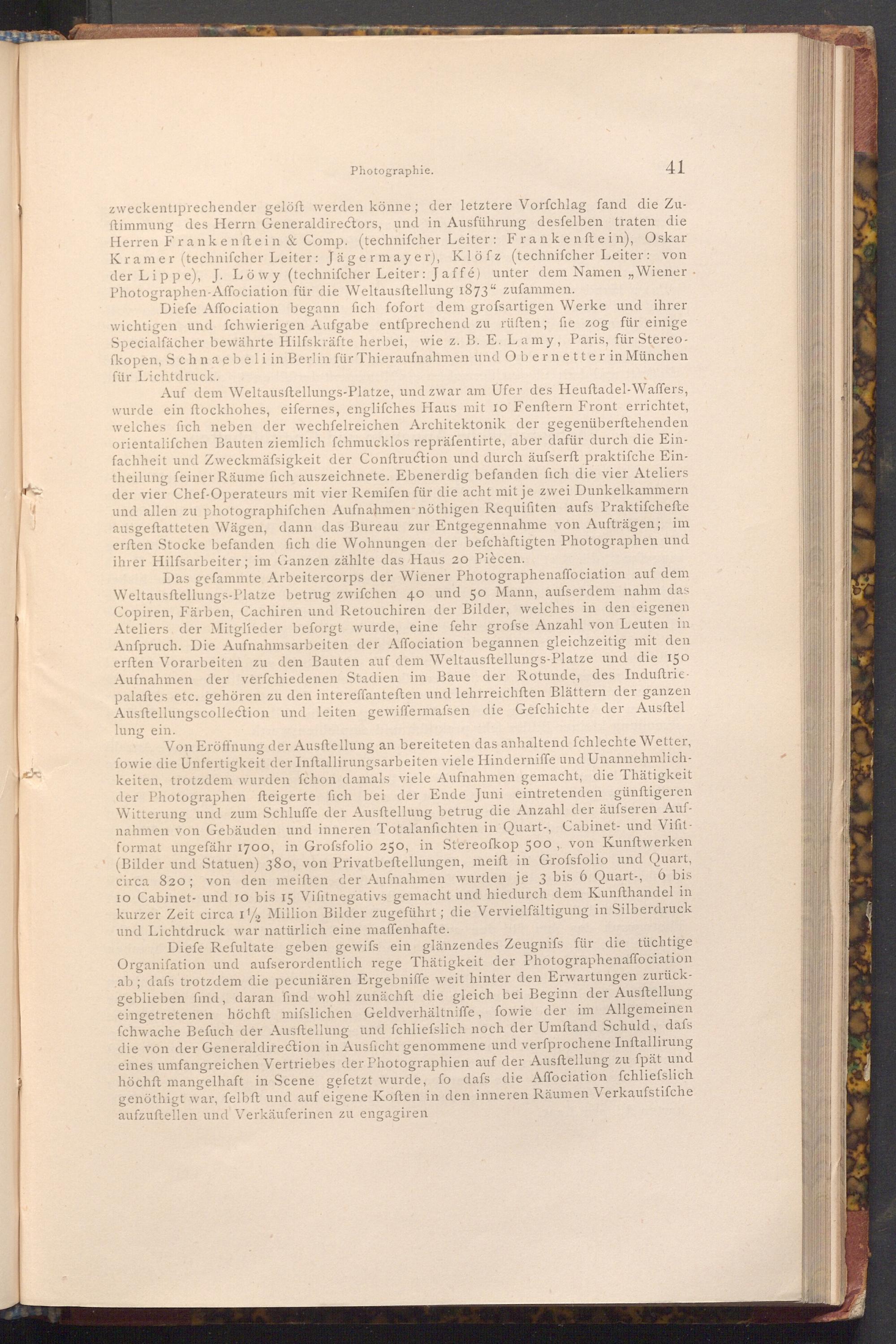zweckentiprechender gelöft werden könne; der letztere Vorfchlag fand die Zuftimmung des Herrn Generaldirectors, und in Ausführung desfelben traten die Herren Frankenftein& Comp.( technifcher Leiter: Frankenftein), Oskar Kramer( technifcher Leiter: Jägermayer), Klöfz( technifcher Leiter: von der Lippe), J. Löwy( technifcher Leiter: Jaffé) unter dem Namen„ ,, Wiener. Photographen- Affociation für die Weltausftellung 1873" zufammen.