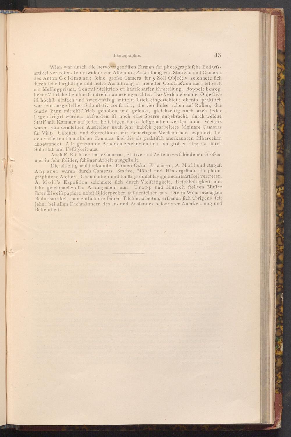 Die allfeitig wohlbekannten Firmen Oskar Kramer, A. Moll und Auguft Angerer waren durch Cameras, Stative, Möbel und Hintergründe für photographifche Ateliers, Chemikalien und fonftige einfchlägige Bedarfsartikel vertreten. A. Moll's Expofition zeichnete fich durch Vielfeitigkeit, Reichhaltigkeit und fehr gefchmackvolles Arrangement aus. Trapp und Münch ftellten Mufter ihrer Eiweifspapiere nebft Bilderproben auf denfelben aus. Die in Wien erzeugten Bedarfsartikel, namentlich die feinen Tifchlerarbeiten, erfreuen fich übrigens feit jeher bei allen Fachmännern des In- und Auslandes befonderer Anerkennung und Beliebtheit.