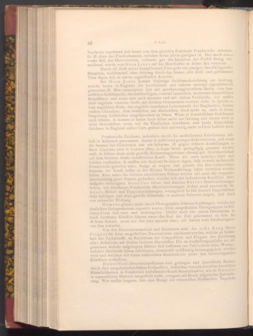 Bei Oven Jones kommt diejenige Gefchmacksrichtung zur Geltung, welche heute in England die herrfchende und nahezu national eigenthümlich geworden ift. Man emancipirte fich mit anerkennungswerthem Muthe, vom franzöfifchen Gefchmacke, der muthwilligen, reizend launifchen, modernen franzöfifchen Renaiffance, und wenn man auch mitunter und mit vielem Verdienfte, wir müffen diefs zugeben, einzelne Stoffe mit folchen Ornamenten verziert fieht, fo fpricht es dem englifchen Blute, der englifch vornehmen Lebensweife des Engländers, feinem ernften Charakter, dem deutfchen am ähnlichften, doch mehr zu, auch in feiner Umgebung Aehnliches ausgefprochen zu fehen. Wenn er franzöfifchen Gefchmack auch fchätzt, fo kommt er heute doch felten mehr zur Geltung und darum wird es nicht überrafchen, wenn wir die Thatfachen erwähnen, dafs heute franzöfifche Zeichner in England aufser Curs gefetzt find und wenig mehr in Paris beftellt wird.