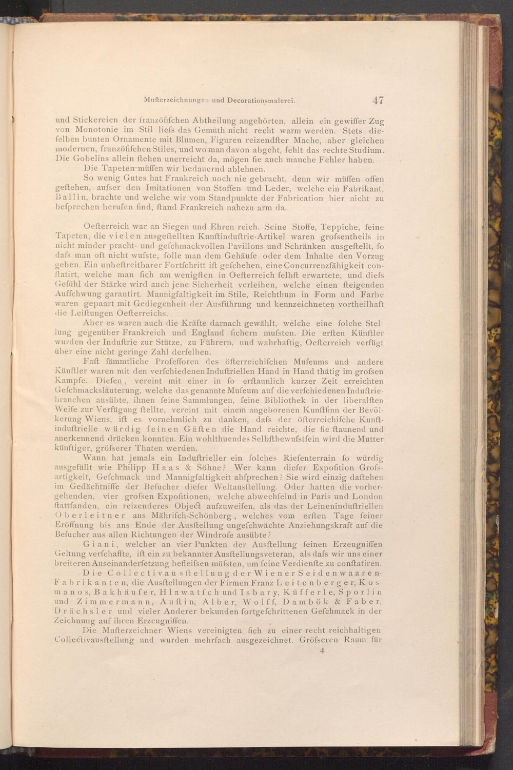 Giani, welcher an vier Punkten der Ausftellung feinen Erzeugniffen Geltung verfchaffte, ift ein zu bekannter Ausftellungsveteran, als dafs wir uns einer breiteren Auseinanderfetzung befleifsen müfsten, um feine Verdienfte zu conftatiren. Die Collectivausftellung der Wiener SeidenwaarenFabrikanten, die Ausstellungen der Firmen Franz Leitenberger, Kosmanos, Bakhäufer, Hlawatfch und Is bary, Küfferle, Sporlin und Zimmermann, Auftin, Alber, Wolff, Dambök& Faber, Drächsler und vieler Anderer bekunden fortgefchrittenen Gefchmack in der Zeichnung auf ihren Erzeugniffen.