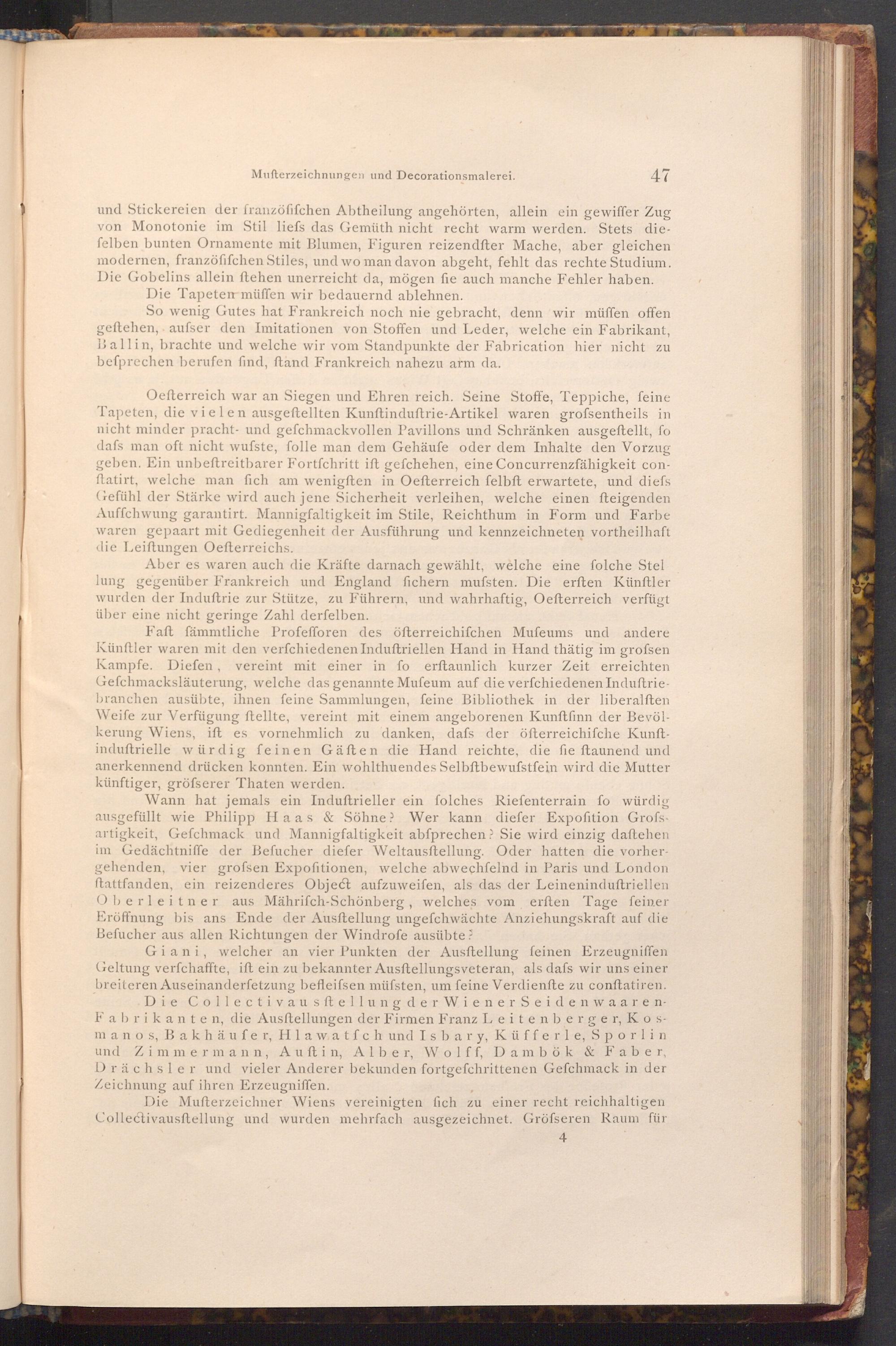 Wann hat jemals ein Induftrieller ein folches Riefenterrain fo würdig ausgefüllt wie Philipp Haas& Söhne? Wer kann diefer Expofition Grofsartigkeit, Gefchmack und Mannigfaltigkeit abfprechen? Sie wird einzig daftehen im Gedächtniffe der Befucher diefer Weltausftellung. Oder hatten die vorhergehenden, vier grofsen Expofitionen, welche abwechfelnd in Paris und London ftattfanden, ein reizenderes Object aufzuweifen, als das der Leineninduftriellen Oberleitner aus Mährifch- Schönberg, welches vom erften Tage feiner Eröffnung bis ans Ende der Ausftellung ungefchwächte Anziehungskraft auf die Befucher aus allen Richtungen der Windrofe ausübte?