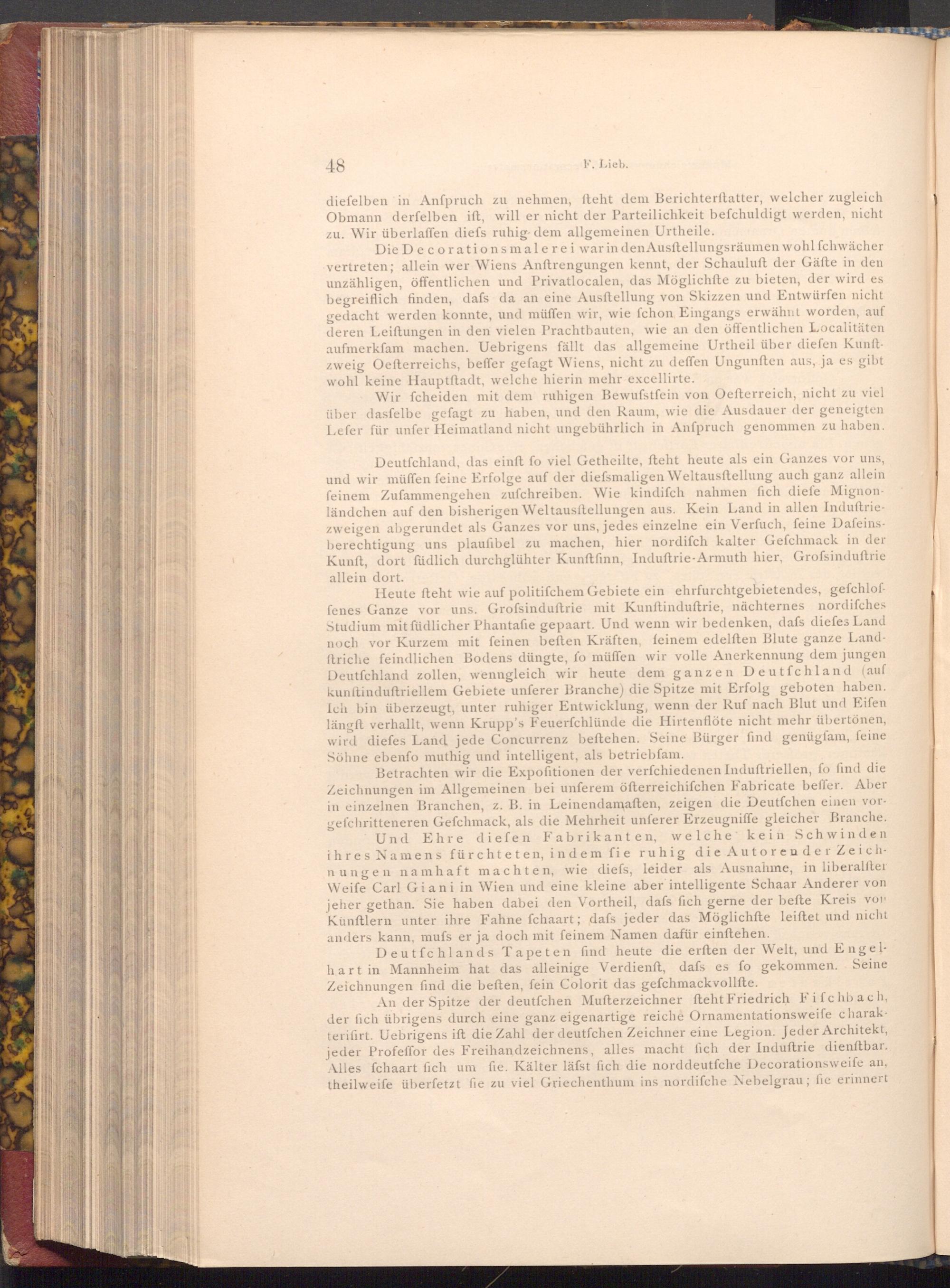 Heute ſteht wie auf politifchem Gebiete ein ehrfurchtgebietendes, gefchloffenes Ganze vor uns. Grofsinduftrie mit Kunftinduftrie, nächternes nordifches Studium mit füdlicher Phantafie gepaart. Und wenn wir bedenken, dafs diefes Land noch vor Kurzem mit feinen beften Kräften, feinem edelften Blute ganze Landftriche feindlichen Bodens düngte, fo müffen wir volle Anerkennung dem jungen Deutſchland zollen, wenngleich wir heute dem ganzen Deutfchland( auf kunftinduftriellem Gebiete unferer Branche) die Spitze mit Erfolg geboten haben. Ich bin überzeugt, unter ruhiger Entwicklung, wenn der Ruf nach Blut und Eifen längft verhallt, wenn Krupp's Feuerfchlünde die Hirtenflöte nicht mehr übertönen, wird diefes Land jede Concurrenz beftehen. Seine Bürger find genügfam, feine Söhne ebenfo muthig und intelligent, als betriebfam.