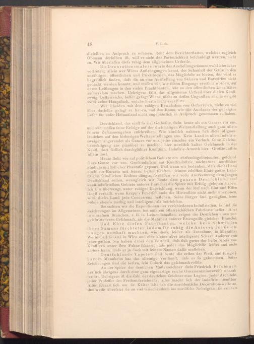 Betrachten wir die Expofitionen der verfchiedenen Induftriellen, fo find die Zeichnungen im Allgemeinen bei unferem öfterreichifchen Fabricate beffer. Aber in einzelnen Branchen, z. B. in Leinendamaften, zeigen die Deutfchen einen vorgefchritteneren Gefchmack, als die Mehrheit unferer Erzeugniffe gleicher Branche.