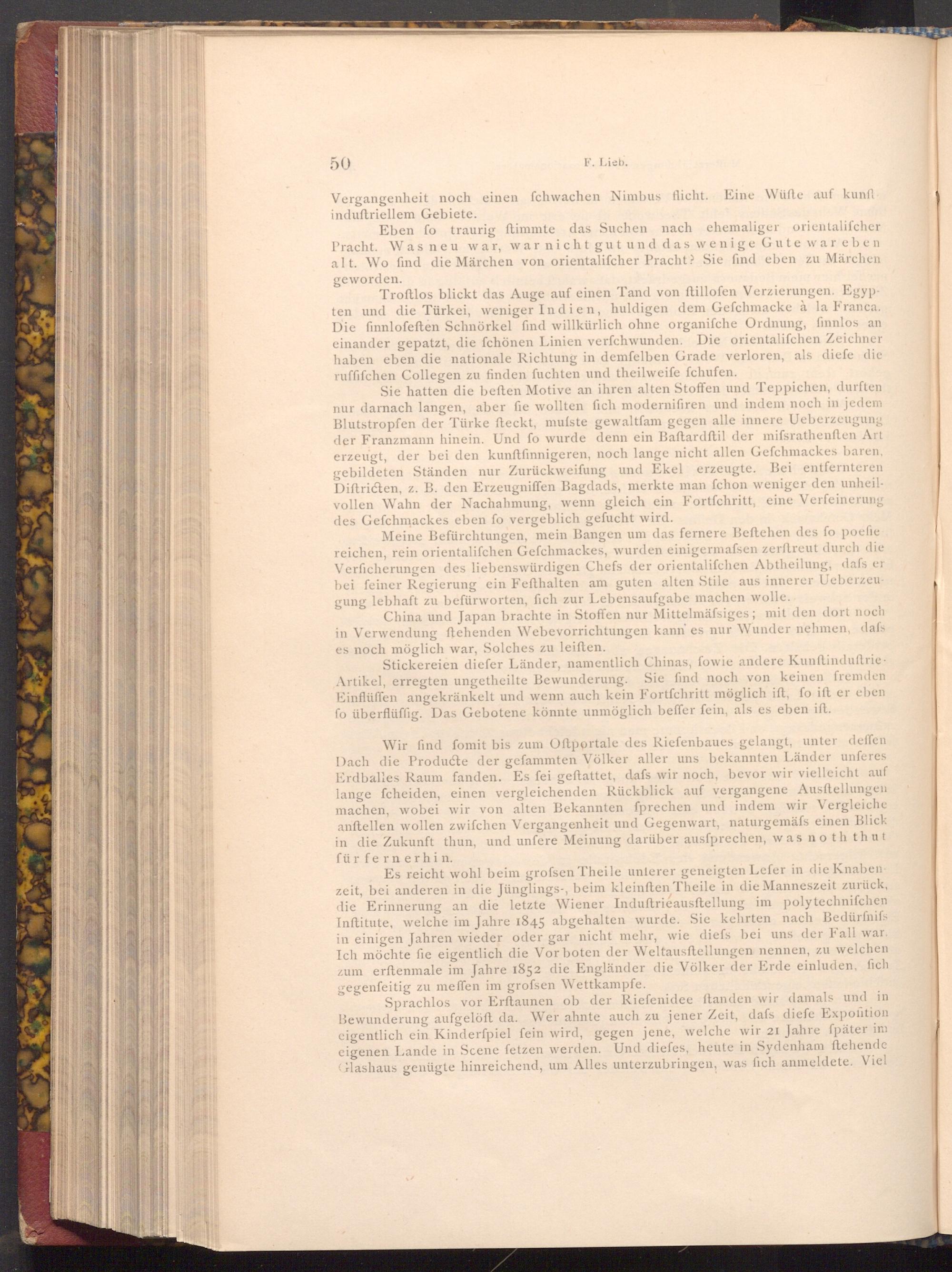 Wir find fomit bis zum Oftportale des Riefenbaues gelangt, unter deffen Dach die Producte der gefammten Völker aller uns bekannten Länder unferes Erdballes Raum fanden. Es fei geftattet, dafs wir noch, bevor wir vielleicht auf lange fcheiden, einen vergleichenden Rückblick auf vergangene Ausftellungen machen, wobei wir von alten Bekannten fprechen und indem wir Vergleiche anftellen wollen zwifchen Vergangenheit und Gegenwart, naturgemäfs einen Blick in die Zukunft thun, und unfere Meinung darüber ausfprechen, was noth thut für fernerhin.