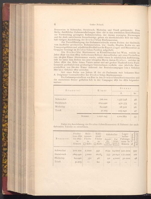 Die Dreher'fche Bierbrauerei zu Kleinfchwechat bei Wien, welche im Jahre 1836 von dem 1863 verftorbenen Befitzer Anton Dreher mit einer Production von 26.560 Eimer übernommen wurde, erfuhr einen fo erheblichen Auffchwung, dafs fie unter dem Befitze des jetzt lebenden Herrn Anton Dreher, welcher im Jahre 1870 das Erbe feines Vaters antrat und mit grofser Thatkraft fowie Fachkenntnifs perfönlich dem grofsartigen Unternehmen vorfteht, eine jährliche Bierproduction von 716.160 Eimer während der Betriebs campagne vom 1. October 1871 bis 1. October 1872 erreichte.