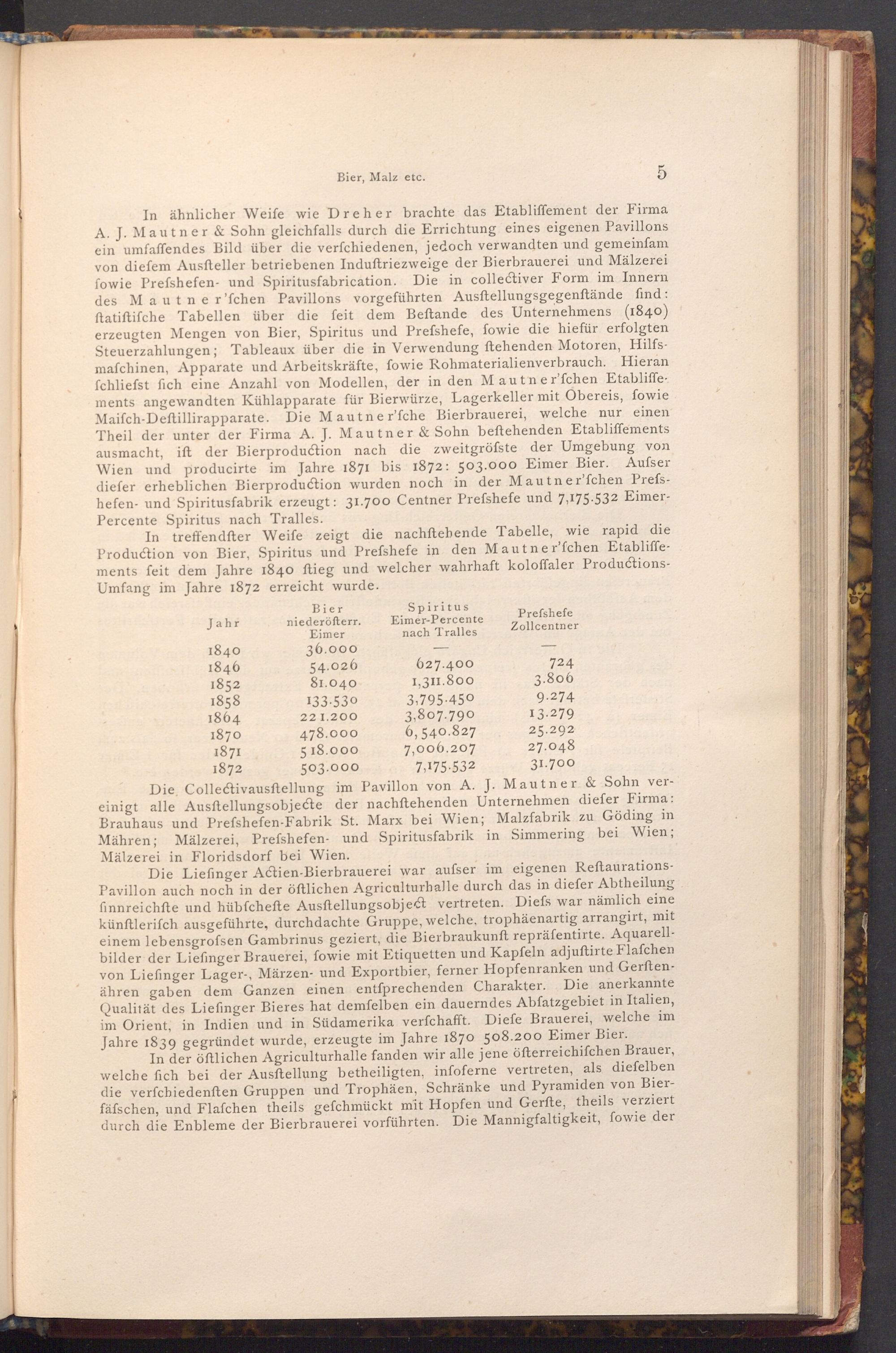 Die Collectivausftellung im Pavillon von A. J. Mautner& Sohn vereinigt alle Ausftellungsobjecte der nachftehenden Unternehmen diefer Firma: Brauhaus und Prefshefen- Fabrik St. Marx bei Wien; Malzfabrik zu Göding in Mähren; Mälzerei, Prefshefen- und Spiritusfabrik in Simmering bei Wien; Mälzerei in Floridsdorf bei Wien.