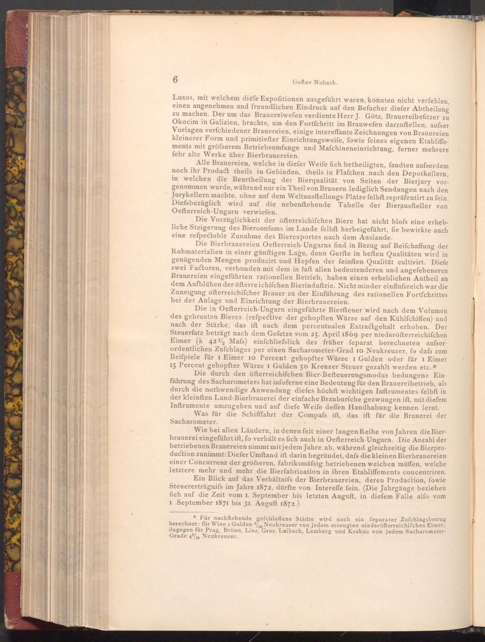 Die in Oefterreich- Ungarn eingeführte Bierfteuer wird nach dem Volumen des gebrauten Bieres( refpective der gehopften Würze auf den Kühlfchiffen) und nach der Stärke, das ift nach dem percentualen Extractgehalt erhoben. Der Steuerfatz beträgt nach dem Gefetze vom 25. April 1869 per niederösterreichifchen Eimer( à 42% Mafs) einfchliefslich des früher feparat berechneten aufserordentlichen Zufchlages per einen Sacharometer- Grad 10 Neukreuzer, fo dafs zum Beiſpiele für 1 Eimer 10 Percent gehopfter Würze I Gulden oder für 1 Eimer 15 Percent gehopfter Würze I Gulden 50 Kreuzer Steuer gezahlt werden etc.*