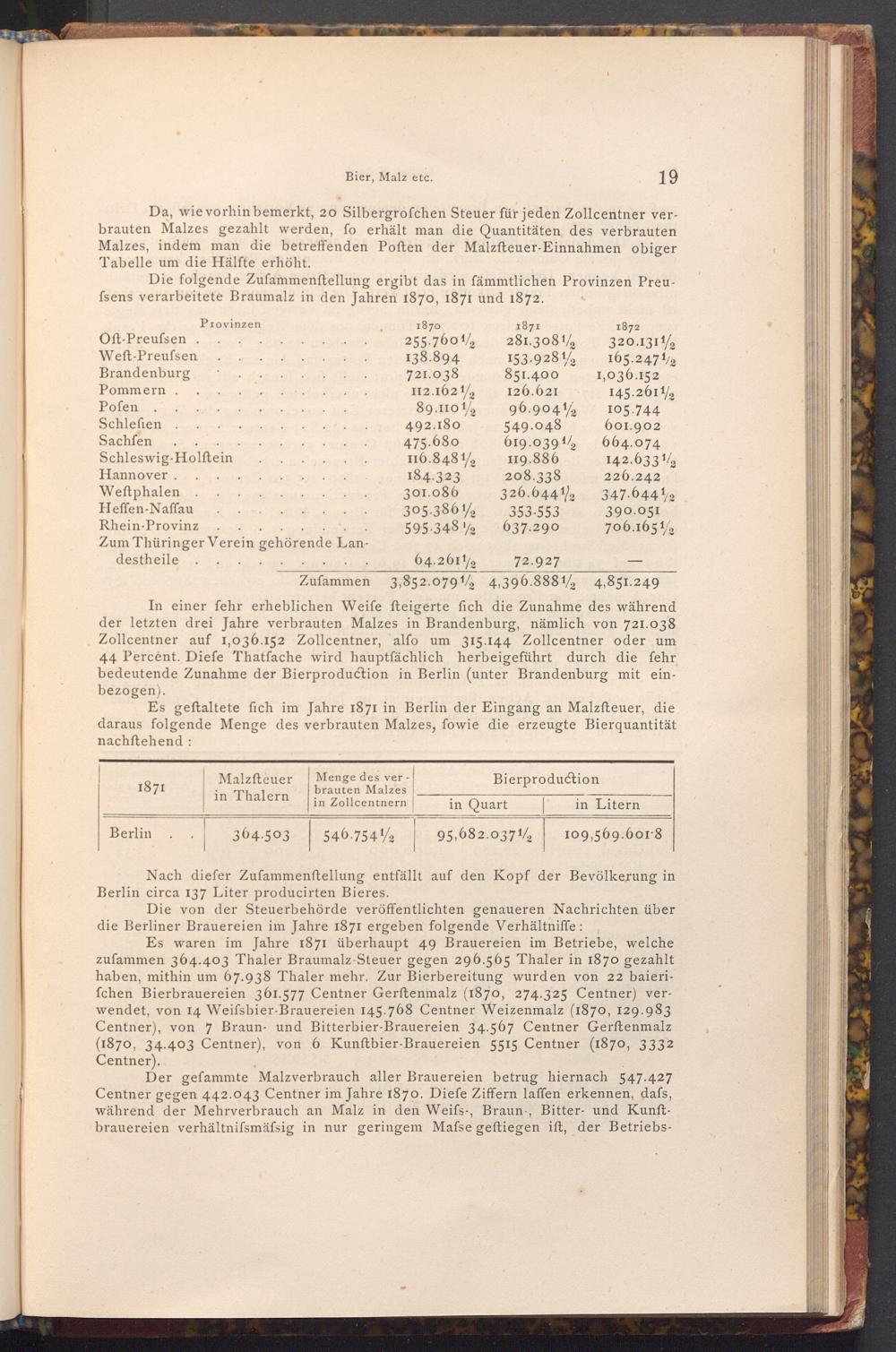 Es geftaltete fich im Jahre 1871 in Berlin der Eingang an Malzfteuer, die daraus folgende Menge des verbrauten Malzes, fowie die erzeugte Bierquantität nachftehend: