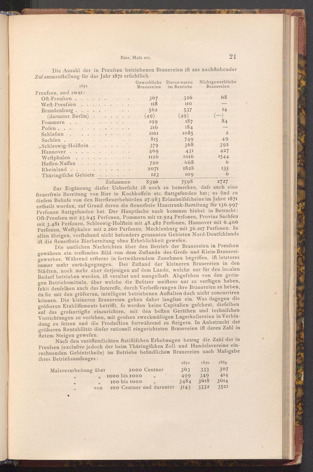 Die amtlichen Nachrichten über den Betrieb der Brauereien in Preussen gewähren ein treffendes Bild von dem Zuftande des Grofs- und Klein- Brauereigewerbes. Während erfteres in fortwährendem Zunehmen begriffen, ift letzteres immer mehr zurückgegangen. Der Zuftand der kleineren Brauereien in den Städten, noch mehr aber derjenigen auf dem Lande, welche nur für den localen Bedarf betrieben werden, ift veraltet und mangelhaft. Abgefehen von den geringen Betriebsmitteln, über welche die Befitzer meiſtens nur zu verfügen haben, fehit denfelben auch das Intereffe, durch Verbefferungen ihre Brauereien zu heben, da fie mit den gröfseren, intelligent betriebenen Anftalten doch nicht concurriren können. Die kleineren Brauereien gehen daher langfam ein. Was dagegen die gröfseren Etabliffements betrifft, fo werden keine Capitalien gefcheut, diefelben auf das grofsartigfte einzurichten, mit den beften Geräthen und techniſchen Vorrichtungen zu verfehen, mit grofsen zweckmäfsigen Lagerkellereien in Verbindung zu fetzen und die Production fortwährend zu fteigern. In Anbetracht der gröfseren Rentabilität diefer rationell eingerichteten Brauereien ift deren Zahl in ftetem Steigen gewefen.
