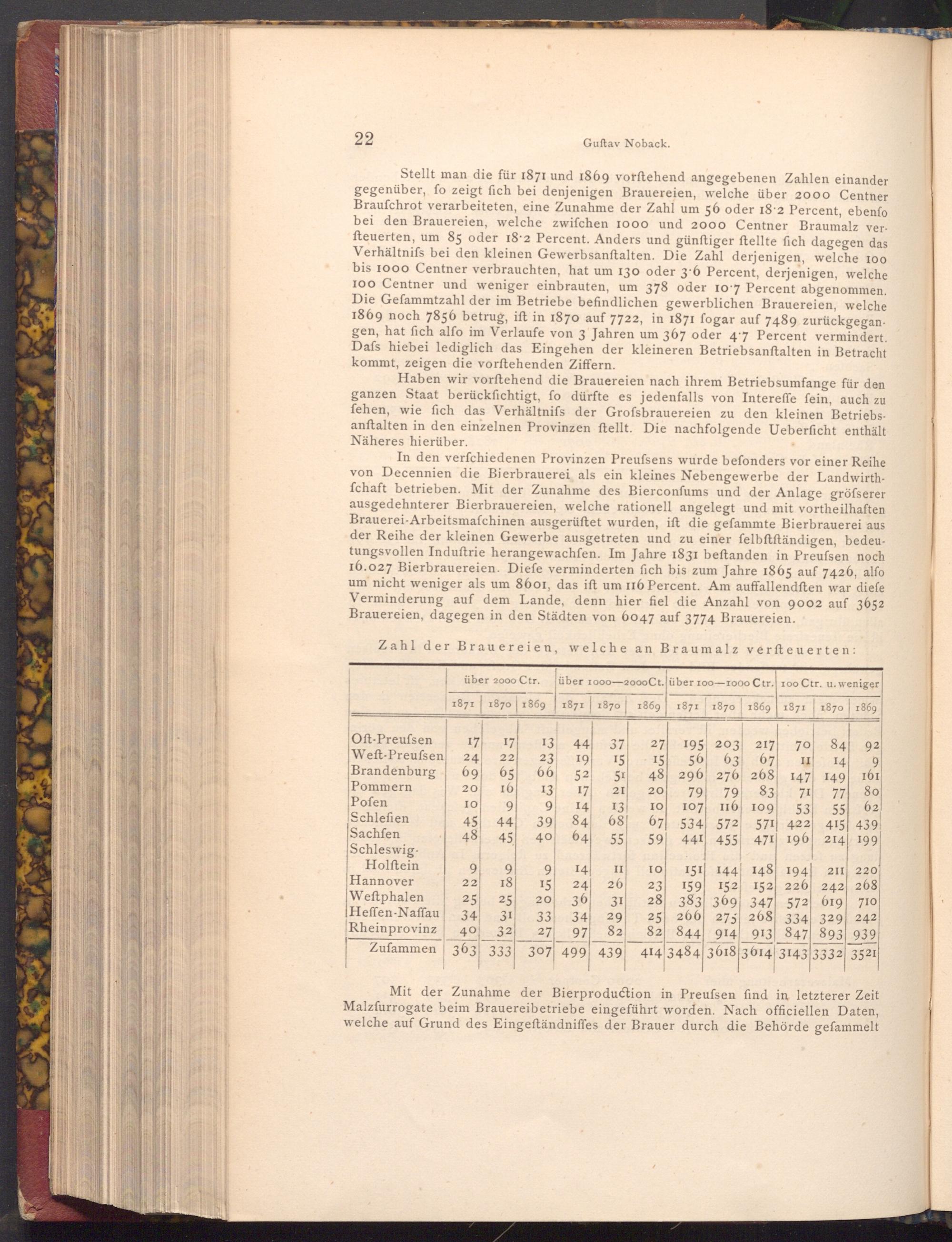 Stellt man die für 1871 und 1869 vorſtehend angegebenen Zahlen einander gegenüber, fo zeigt fich bei denjenigen Brauereien, welche über 2000 Centner Braufchrot verarbeiteten, eine Zunahme der Zahl um 56 oder 18 2 Percent, ebenfo bei den Brauereien, welche zwifchen 1000 und 2000 Centner Braumalz verfteuerten, um 85 oder 18-2 Percent. Anders und günftiger ftellte fich dagegen das Verhältnifs bei den kleinen Gewerbsanftalten. Die Zahl derjenigen, welche 100 bis 1000 Centner verbrauchten, hat um 130 oder 3.6 Percent, derjenigen, welche 100 Centner und weniger einbrauten, um 378 oder 10 7 Percent abgenommen. Die Gefammtzahl der im Betriebe befindlichen gewerblichen Brauereien, welche 1869 noch 7856 betrug, ift in 1870 auf 7722, in 1871 fogar auf 7489 zurückgegangen, hat fich alfo im Verlaufe von 3 Jahren um 367 oder 4'7 Percent vermindert. Dafs hiebei lediglich das Eingehen der kleineren Betriebsanftalten in Betracht kommt, zeigen die vorftehenden Ziffern.