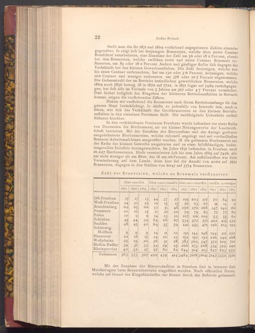 In den verfchiedenen Provinzen Preufsens wurde befonders vor einer Reihe von Decennien die Bierbrauerei als ein kleines Nebengewerbe der Landwirthfchaft betrieben. Mit der Zunahme des Bierconfums und der Anlage gröfserer ausgedehnterer Bierbrauereien, welche rationell angelegt und mit vortheilhaften Brauerei- Arbeitsmafchinen ausgerüftet wurden, ift die gefammte Bierbrauerei aus der Reihe der kleinen Gewerbe ausgetreten und zu einer felbftſtändigen, bedeutungsvollen Induftrie herangewachfen. Im Jahre 1831 beftanden in Preufsen noch 16.027 Bierbrauereien. Diefe verminderten fich bis zum Jahre 1865 auf 7426, alfo um nicht weniger als um 8601, das ift um 116 Percent. Am auffallendften war diefe Verminderung auf dem Lande, denn hier fiel die Anzahl von 9002 auf 3652 Brauereien, dagegen in den Städten von 6047 auf 3774 Brauereien.