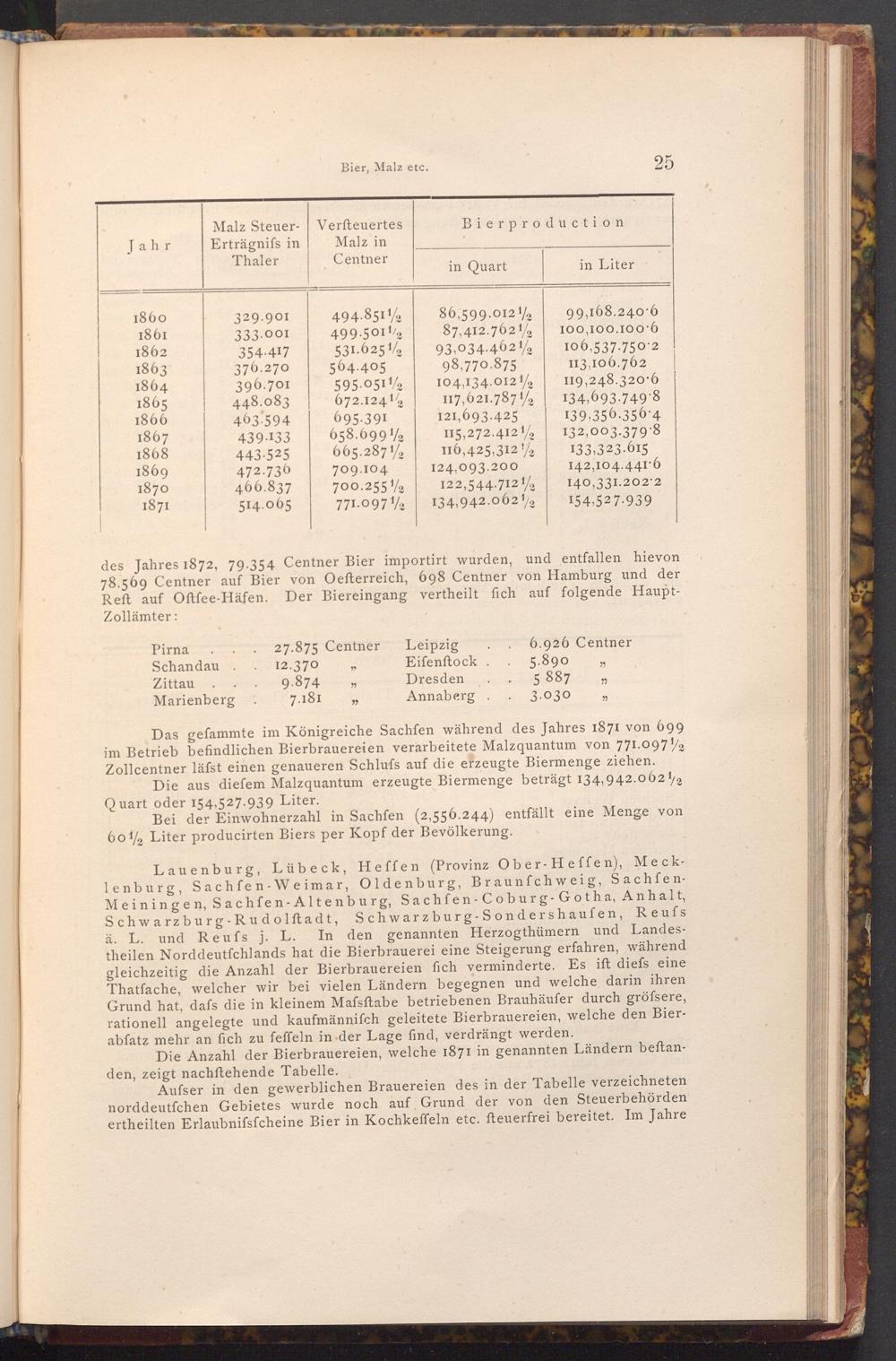 Das gefammte im Königreiche Sachfen während des Jahres 1871 von 699 im Betrieb befindlichen Bierbrauereien verarbeitete Malzquantum von 771.097% Zollcentner läfst einen genaueren Schlufs auf die erzeugte Biermenge ziehen.