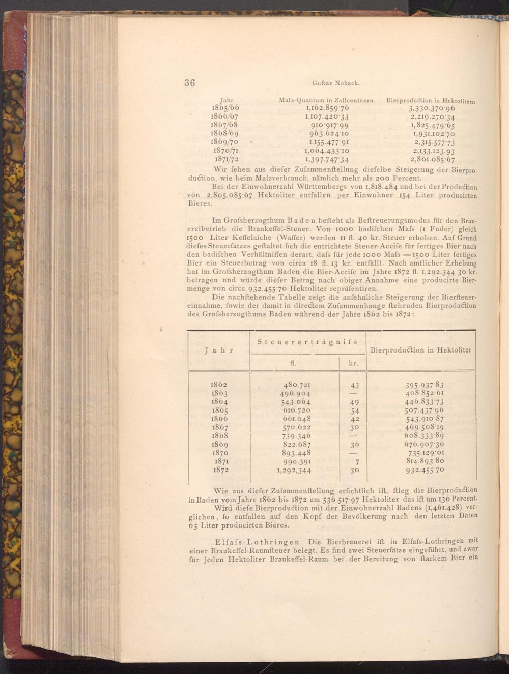 Die nachstehende Tabelle zeigt die anfehnliche Steigerung der Bierfteuereinnahme, fowie der damit in directem Zufammenhange ftehenden Bierproduction des Grofsherzogthums Baden während der Jahre 1862 bis 1872: