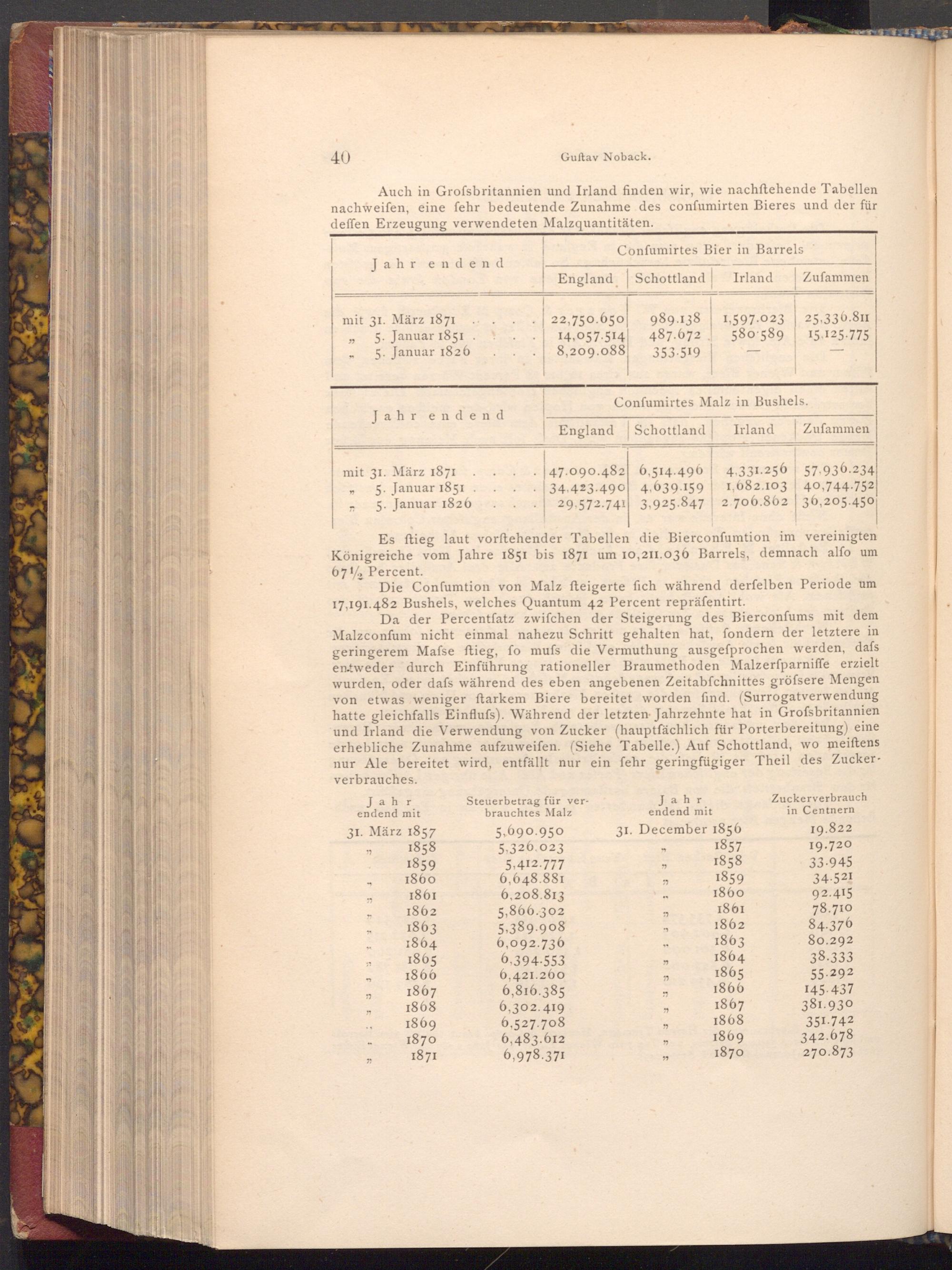 Auch in Grofsbritannien und Irland finden wir, wie nachftehende Tabellen nachweifen, eine fehr bedeutende Zunahme des confumirten Bieres und der für deffen Erzeugung verwendeten Malzquantitäten.