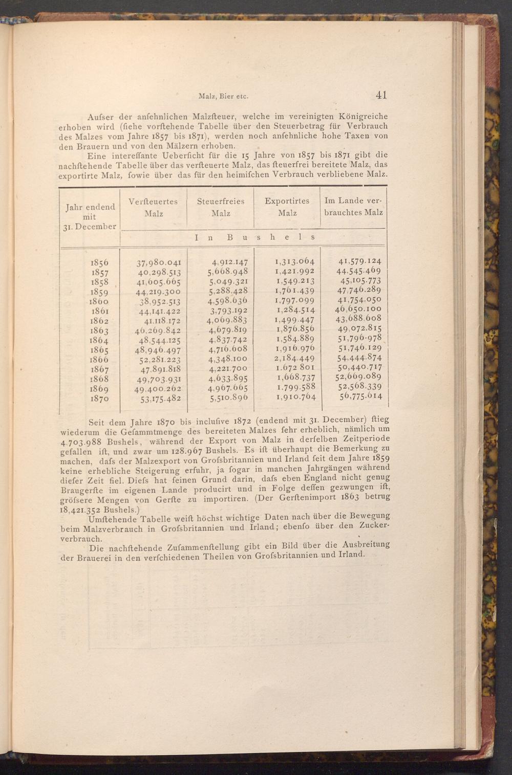 Aufser der anfehnlichen Malzfteuer, welche im vereinigten Königreiche erhoben wird( fiehe vorftehende Tabelle über den Steuerbetrag für Verbrauch des Malzes vom Jahre 1857 bis 1871), werden noch anfehnliche hohe Taxen von den Brauern und von den Mälzern erhoben.
