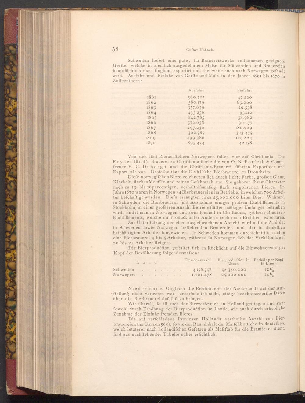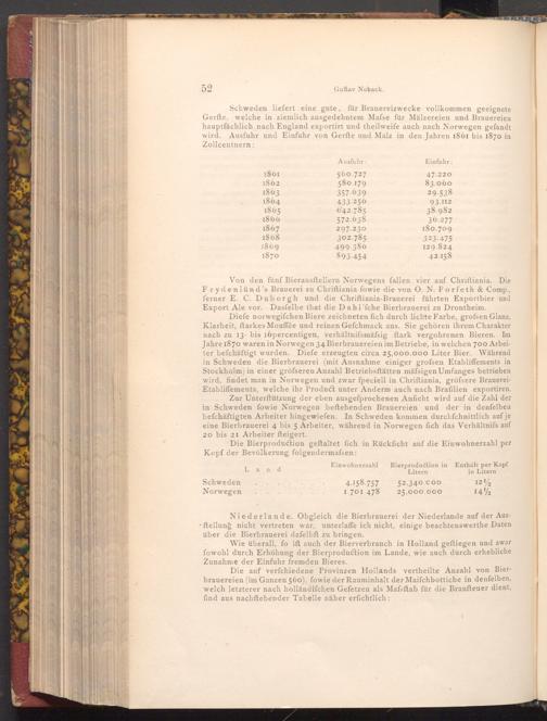 Diefe norwegifchen Biere zeichneten fich durch lichte Farbe, grofsen Glanz, Klarheit, ftarkes Mouffée und reinen Gefchmack aus. Sie gehören ihrem Charakter nach zu 13- bis 16percentigen, verhältnifsmäfsig ftark vergohrenen Bieren. Im Jahre 1870 waren in Norwegen 34 Bierbrauereien im Betriebe, in welchen 700 Arbeiter befchäftigt wurden. Diefe erzeugten circa 25,000.000 Liter Bier. Während in Schweden die Bierbrauerei( mit Ausnahme einiger grofsen Etabliffements in Stockholm) in einer gröfseren Anzahl Betriebsftätten mäfsigen Umfanges betrieben wird, findet man in Norwegen und zwar fpeciell in Chriftiania, gröfsere BrauereiEtabliffements, welche ihr Product unter Anderm auch nach Brafilien exportiren. Zur Unterstützung der eben ausgefprochenen Anficht wird auf die Zahl der in Schweden fowie Norwegen beftehenden Brauereien und der in denfelben befchäftigten Arbeiter hingewiefen. In Schweden kommen durchſchnittlich auf je eine Bierbrauerei 4 bis 5 Arbeiter, während in Norwegen fich das Verhältnifs auf 20 bis 21 Arbeiter fteigert.
