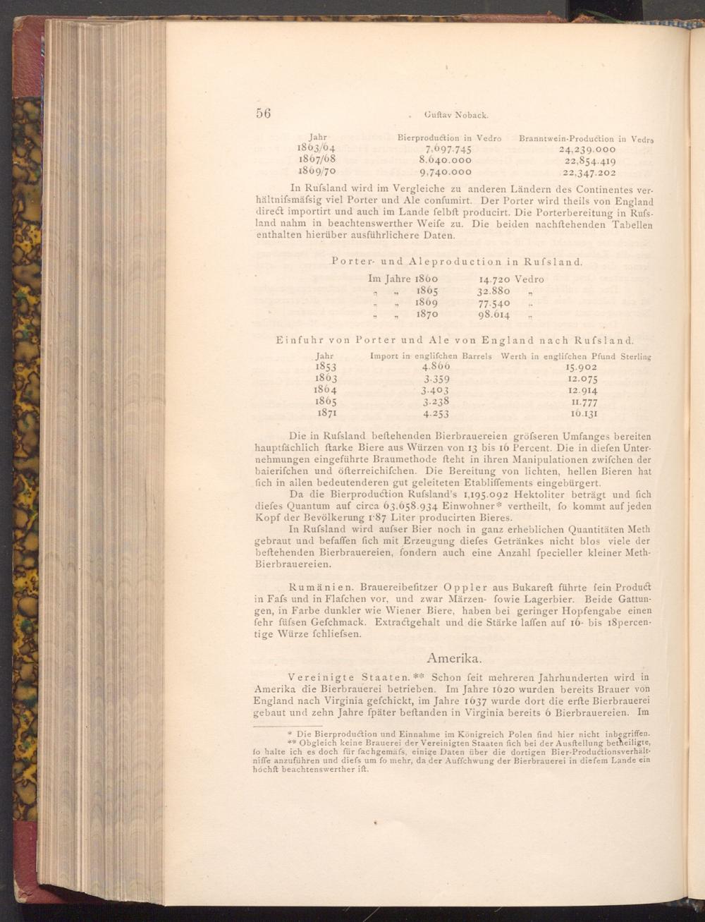 In Rufsland wird im Vergleiche zu anderen Ländern des Continentes verhältnifsmäfsig viel Porter und Ale confumirt. Der Porter wird theils von England direct importirt und auch im Lande felbft producirt. Die Porterbereitung in Rufsland nahm in beachtenswerther Weife zu. Die beiden nachftehenden Tabellen enthalten hierüber ausführlichere Daten.