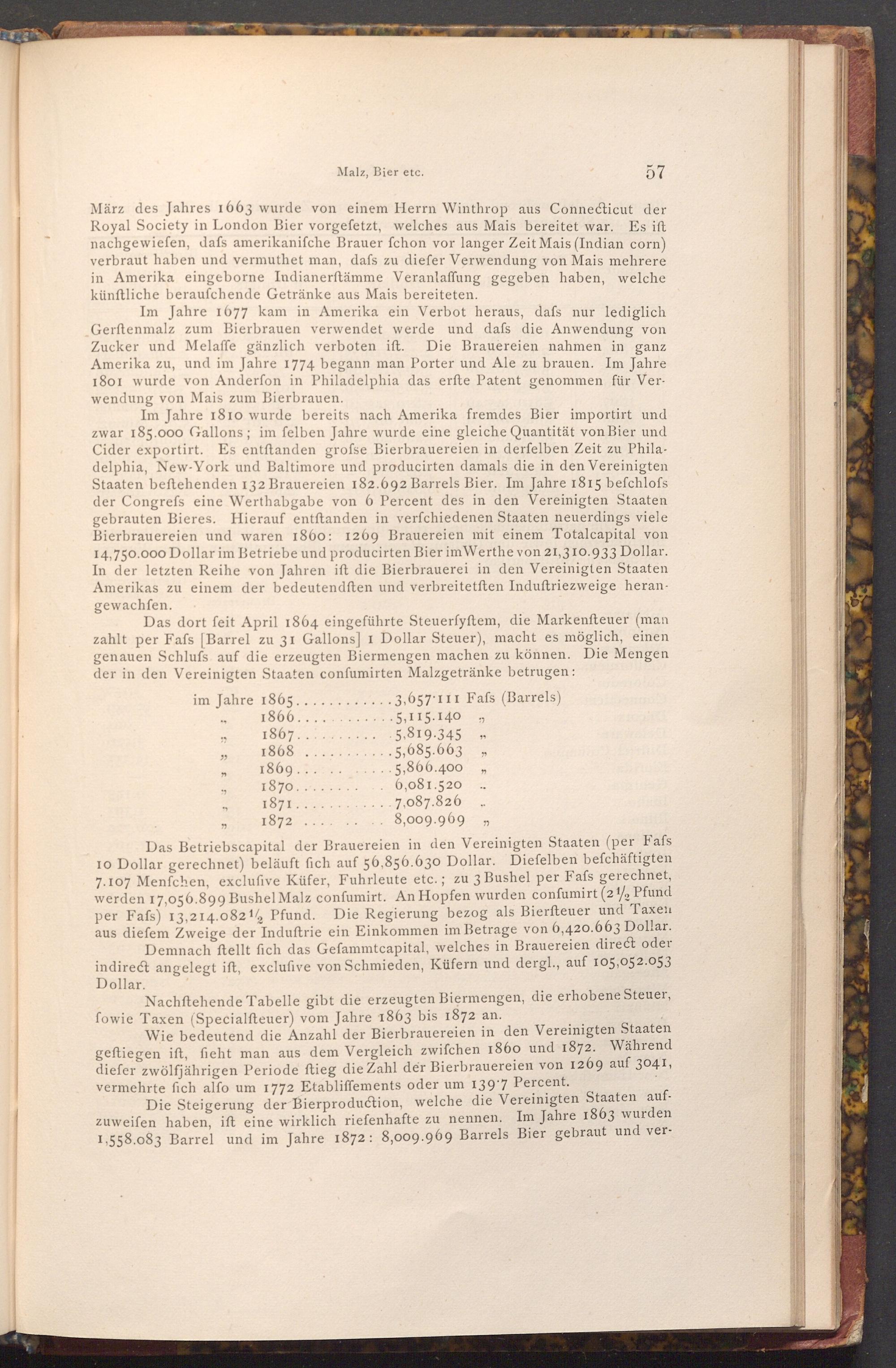 Das dort feit April 1864 eingeführte Steuerfyftem, die Markenfteuer( man zahlt per Fafs[ Barrel zu 31 Gallons] 1 Dollar Steuer), macht es möglich, einen genauen Schlufs auf die erzeugten Biermengen machen zu können. Die Mengen der in den Vereinigten Staaten confumirten Malzgetränke betrugen: