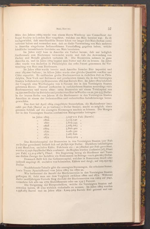 Im Jahre 1677 kam in Amerika ein Verbot heraus, dafs nur lediglich Gerftenmalz zum Bierbrauen verwendet werde und dafs die Anwendung von Zucker und Melaffe gänzlich verboten ift. Die Brauereien nahmen in ganz Amerika zu, und im Jahre 1774 begann man Porter und Ale zu brauen. Im Jahre 1801 wurde von Anderſon in Philadelphia das erfte Patent genommen für Verwendung von Mais zum Bierbrauen.