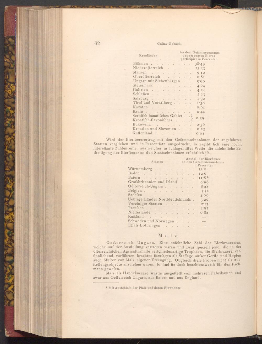 Oefterreich Ungarn. Eine anfehnliche Zahl der Bierbrauereien, welche auf der Ausftellung vertreten waren und zwar fpeciell jene, die in der öfterreichifchen Agriculturhalle verfchiedenartige Trophäen, die Bierbrauerei verfinnlichend, vorführten, brachten fozufagen als Staffage aufser Gerfte und Hopfen auch Mufter von Malz eigener Erzeugung. Obgleich diefe Proben nicht als Ausftellungsobjecte anzufehen waren, fo find fie doch beachtenswerth für den Fachmann gewefen.