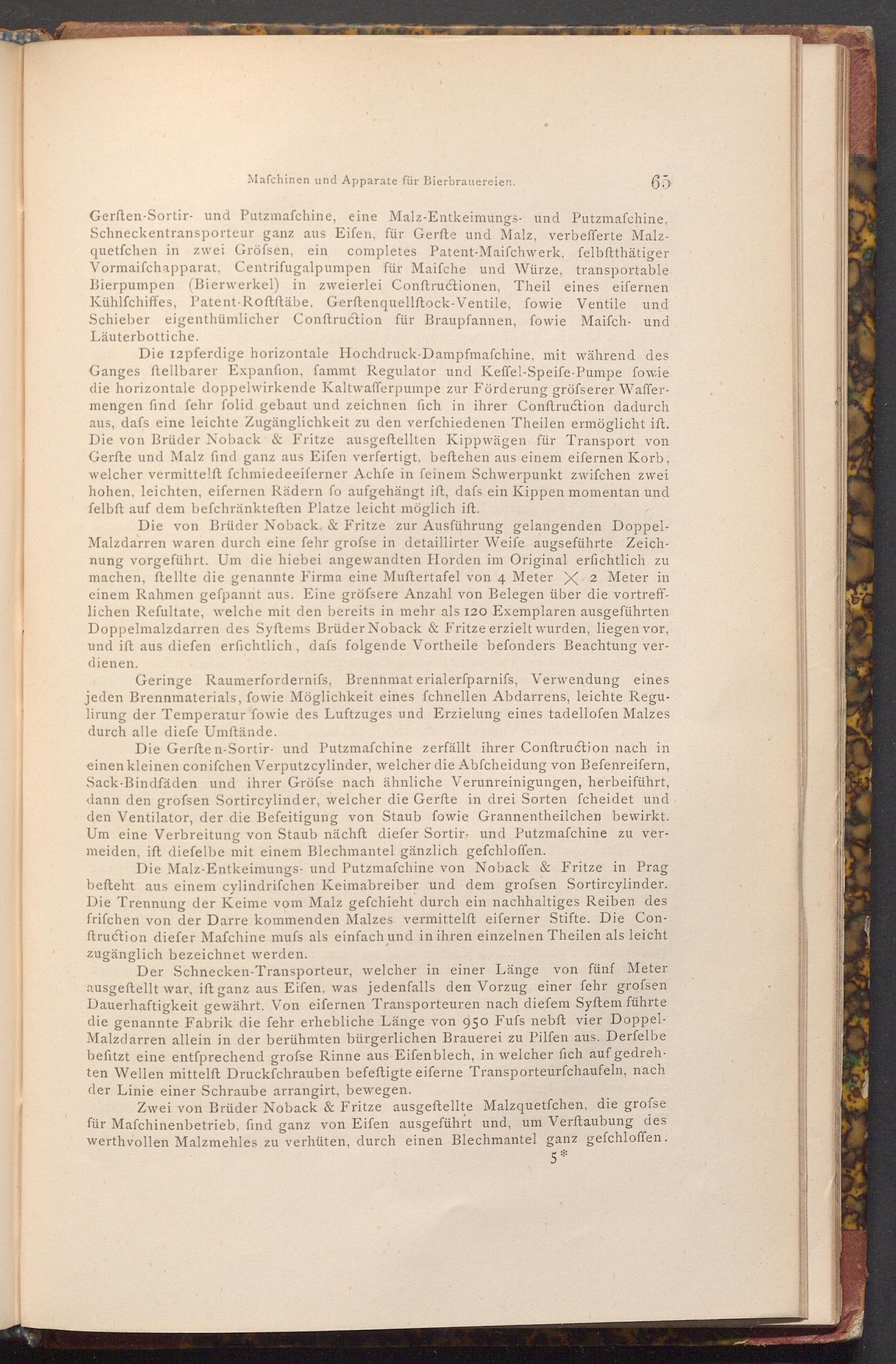 Die von Brüder Noback.& Fritze zur Ausführung gelangenden DoppelMalzdarren waren durch eine fehr grofse in detaillirter Weife augseführte Zeichnung vorgeführt. Um die hiebei angewandten Horden im Original erfichtlich zu machen, ftellte die genannte Firma eine Muftertafel von 4 Meter X 2 Meter in einem Rahmen gefpannt aus. Eine gröfsere Anzahl von Belegen über die vortrefflichen Refultate, welche mit den bereits in mehr als 120 Exemplaren ausgeführten Doppelmalzdarren des Syftems Brüder Noback& Fritze erzielt wurden, liegen vor, und ift aus diefen erfichtlich, dafs folgende Vortheile befonders Beachtung verdienen.