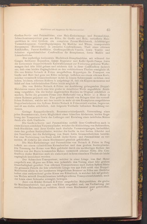 Gerften- Sortir- und Putzmafchine, eine Malz- Entkeimungs- und Putzmafchine, Schneckentransporteur ganz aus Eifen, für Gerfte und Malz, verbefferte Malzquetfchen in zwei Gröfsen, ein completes Patent- Maifchwerk, felbftthätiger Vormaifchapparat, Centrifugalpumpen für Maifche und Würze, transportable Bierpumpen( Bierwerkel) in zweierlei Conftructionen, Theil eines eifernen Kühlfchiffes, Patent- Roftftäbe, Gerftenquellftock- Ventile, fowie Ventile und Schieber eigenthümlicher Conftruction für Braupfannen, fowie Maifch- und Läuterbottiche.