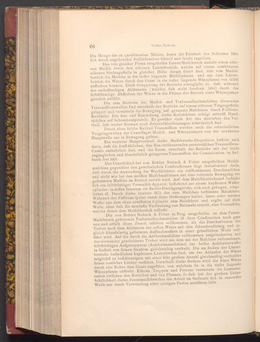 Die von Brüder Noback& Fritze in Prag ausgeftellte, zu dem PatentMaifchwerk gehörende Treberaufhackmafchine ift ihrer Conftruction nach ganz neu und erfüllt ihren Zweck infofern vollkommen, als das Durcharbeiten der Treber nach dem Abläutern der erften Würze mit den fchraubenförmig und zugleich fchaufelartig geformten Aufhackmeffern in einer gründlichen Weife vollführt wird. Auf die durch die Aufhackmafchine vollkommen aufgelockerten und durcheinander gearbeiteten Treber wird aus dem mit der Mafchine verbundenen, felbftthätigen Aufgufsapparat( Anfchwänzmafchine) das heifse Anfchwänzwaffer in Geftalt von feinen Strahlen gleichmäfsig vertheilt. Die am Boden des Läuterbottichs befindlichen kupfernen Läuterböden find, um das Ablaufen der Würze möglichft zu befchleunigen, mit einer fehr grofsen Anzahl gleichmäfsig vertheilter feiner conifcher Löcher verfehen. Unterhalb diefes Bodens wird die klare Würze durch vier Rohre dem Grant zugeführt, von welchem fie in die tiefer liegende Würzepfanne abfliefst. Eiferne Treppen und Perrons vermitteln die Communication zwifchen den Bottichen und den Pfannen, fo dafs bei der grofsen Ueberfichtlichkeit diefes Patentmaifchwerkes die Arbeit im Sudhaufe fich in exactefter Weife nur durch Verwendung einer einzigen Perfon ausführen läfst.