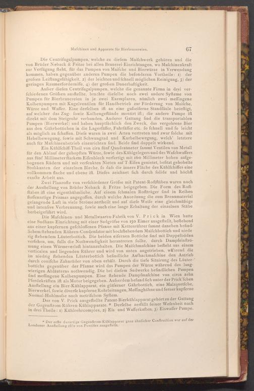 Die Mafchinen- und Metallwaaren- Fabrik von V. Prick in Wien hatte eine Sudhaus Einrichtung mit einer Sudgröfse von 150 Eimer ausgeftellt, beftehend aus einer kupfernen gefchloffenen Pfanne mit Kettenrührer fammt daneben befindlichem ftehenden Röhren- Condenfator mit hochftehendem Maifchbottich und niede rig ftehendem Läuterbottich. Die beiden eifernen Bottiche find mit Doppelböden verfehen, um, falls die Nothwendigkeit herantreten follte, durch Dampfeinftrömung einen Wärmeverluft hintanzuhalten. Die Maifchmafchine befteht aus einem verticalen und liegenden Rührer und wird von unten angetrieben, während die im niedrig ftehenden Läuterbottich befindliche Aufhackmafchine den Antrieb durch conifche Zahnräder von oben erhält. Durch die tiefe Situirung des Läuter-* bottichs gegenüber der Pfanne wird das Pumpen der Würze während des langwierigen Abläuterns nothwendig. Die bei diefem Sudwerke befindlichen Pumpen find meffingene Kolbenpumpen. Eine ftehende Dampfmafchine von circa zehn Pferdekräften ift als Motor beigegeben. Aufserdem befand fich unter der Prick'fchen Ausstellung ein Bier- Kühlapparat, ein gläferner Gährbottich, eine Malzquetfche, Bierwerkel, fowie diverfe kupferne Rohrleitungen, Meffinghähne und ferner kupferne Normal- Hohlmafse nach metrifchem Syftem.