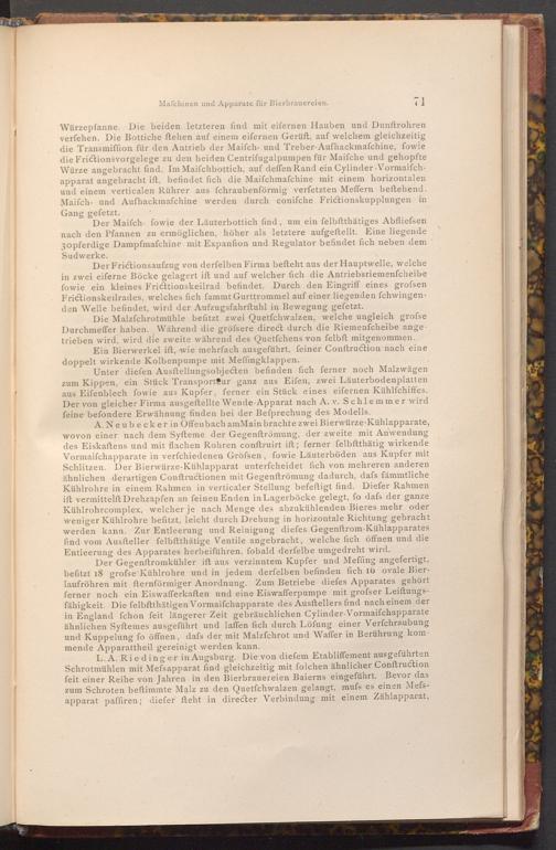 A. Neubecker in Offenbach am Main brachte zwei Bierwürze Kühlapparate, wovon einer nach dem Syfteme der Gegenftrömung, der zweite mit Anwendung des Eiskaftens und mit flachen Rohren conftruirt ift; ferner felbftthätig wirkende Vormaifchapparate in verfchiedenen Gröfsen, fowie Läuterböden aus Kupfer mit Schlitzen. Der Bierwürze- Kühlapparat unterfcheidet fich von mehreren anderen ähnlichen derartigen Conftructionen mit Gegenftrömung dadurch, dafs fämmtliche Kühlrohre in einem Rahmen in verticaler Stellung befeftigt find. Diefer Rahmen ift vermittelft Drehzapfen an feinen Enden in Lagerböcke gelegt, fo dafs der ganze Kühlrohrcomplex, welcher je nach Menge des abzukühlenden Bieres mehr oder weniger Kühlrohre befitzt, leicht durch Drehung in horizontale Richtung gebracht werden kann. Zur Entleerung und Reinigung diefes Gegenftrom- Kühlapparates find vom Aussteller felbftthätige Ventile angebracht, welche fich öffnen und die Entleerung des Apparates herbeiführen, fobald derfelbe umgedreht wird.