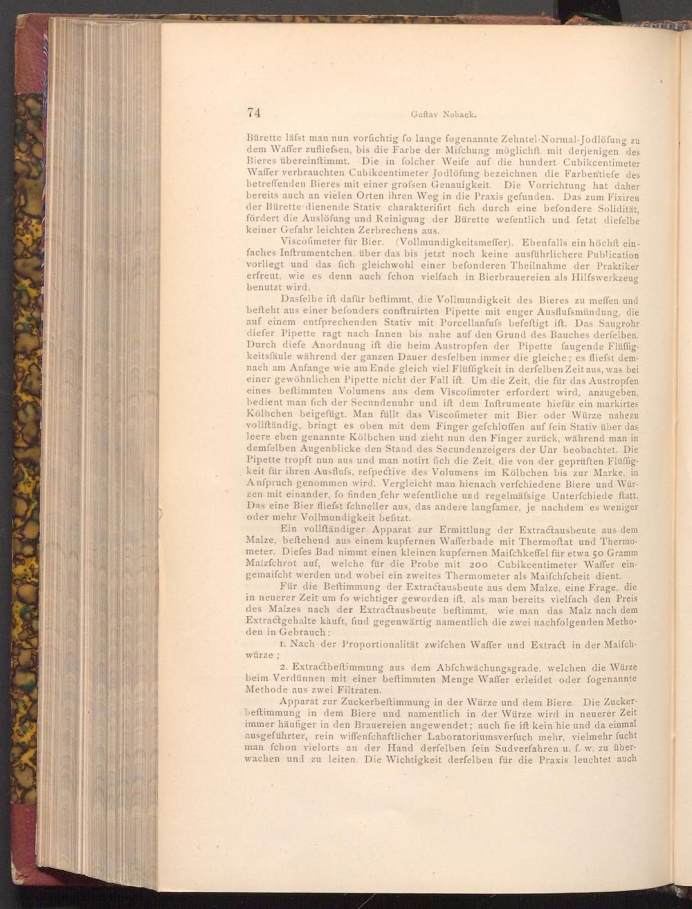 Dasfelbe ift dafür beftimmt, die Vollmundigkeit des Bieres zu meffen und befteht aus einer befonders conftruirten Pipette mit enger Ausflufsmündung, die auf einem entſprechenden Stativ mit Porcellanfufs befeftigt ift. Das Saugrohr diefer Pipette ragt nach Innen bis nahe auf den Grund des Bauches derfelben. Durch diefe Anordnung ift die beim Austropfen der Pipette faugende Flüffigkeitsfäule während der ganzen Dauer desfelben immer die gleiche; es fliefst demnach am Anfange wie am Ende gleich viel Flüffigkeit in derfelben Zeit aus, was bei einer gewöhnlichen Pipette nicht der Fall ift. Um die Zeit, die für das Austropfen eines beftimmten Volumens aus dem Viscofimeter erfordert wird, anzugeben, bedient man fich der Secundenuhr und ift dem Inftrumente hiefür ein markirtes Kölbchen beigefügt. Man füllt das Viscofimeter mit Bier oder Würze nahezu vollſtändig, bringt es oben mit dem Finger gefchloffen auf fein Stativ über das leere eben genannte Kölbchen und zieht nun den Finger zurück, während man in demfelben Augenblicke den Stand des Secundenzeigers der Uhr beobachtet. Die Pipette tropft nun aus und man notirt fich die Zeit, die von der geprüften Flüffigkeit für ihren Ausflufs, refpective des Volumens im Kölbchen bis zur Marke, in Anfpruch genommen wird. Vergleicht man hienach verfchiedene Biere und Würzen mit einander, fo finden, fehr wefentliche und regelmäfsige Unterfchiede ftatt. Das eine Bier fliefst fchneller aus, das andere langfamer, je nachdem es weniger oder mehr Vollmundigkeit befitzt.
