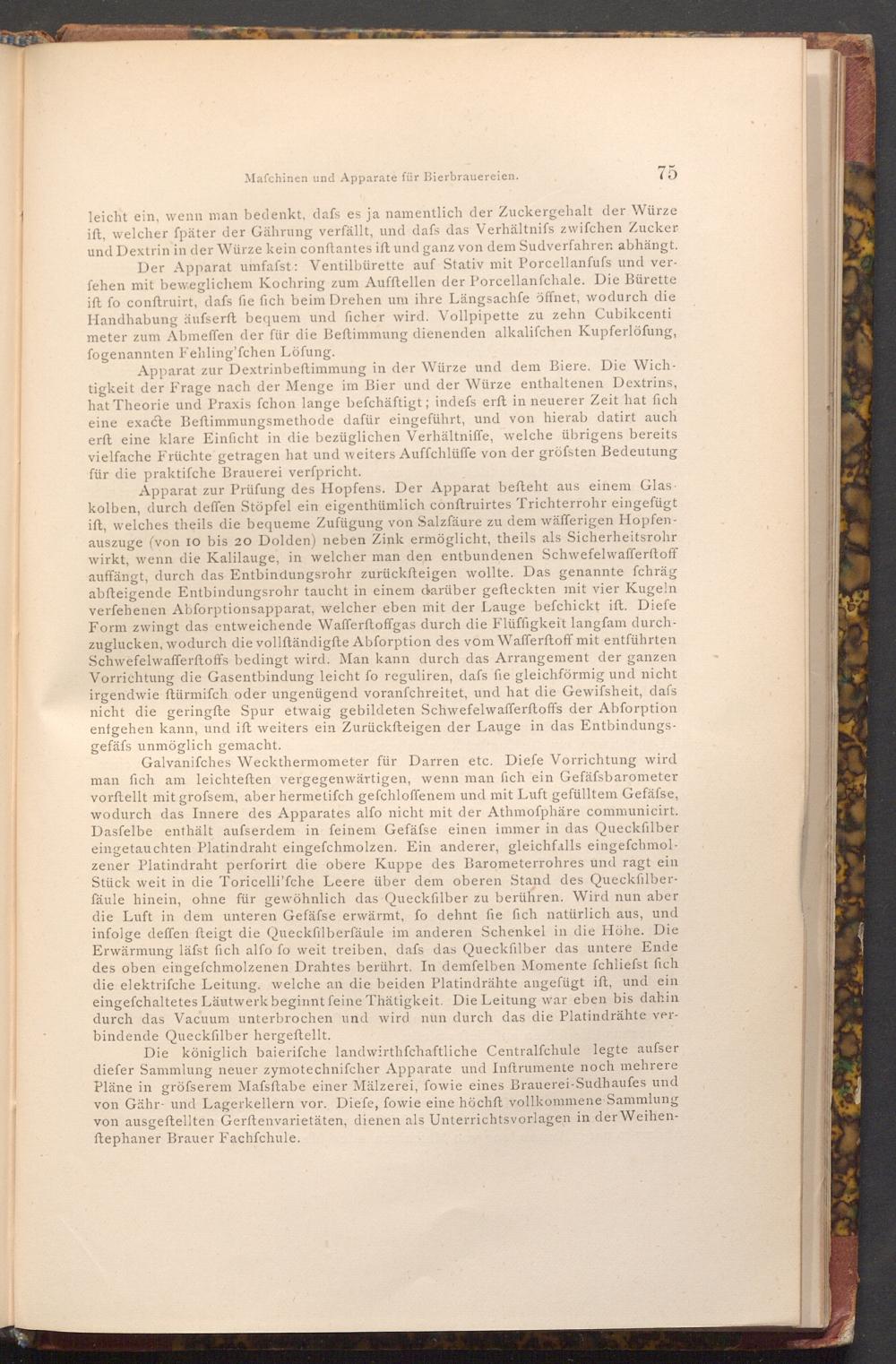 75 leicht ein, wenn man bedenkt, dafs es ja namentlich der Zuckergehalt der Würze ift, welcher fpäter der Gährung verfällt, und dafs das Verhältnifs zwifchen Zucker und Dextrin in der Würze kein conftantes ift und ganz von dem Sudverfahren abhängt. Der Apparat umfafst: Ventilbürette auf Stativ mit Porcellanfufs und verfehen mit beweglichem Kochring zum Aufftellen der Porcellanfchale. Die Bürette ift fo conftruirt, dafs fie fich beim Drehen um ihre Längsachfe öffnet, wodurch die Handhabung äufserft bequem und ficher wird. Vollpipette zu zehn Cubikcenti meter zum Abmeffen der für die Beftimmung dienenden alkalifchen Kupferlöfung, fogenannten Fehling'fchen Löfung.