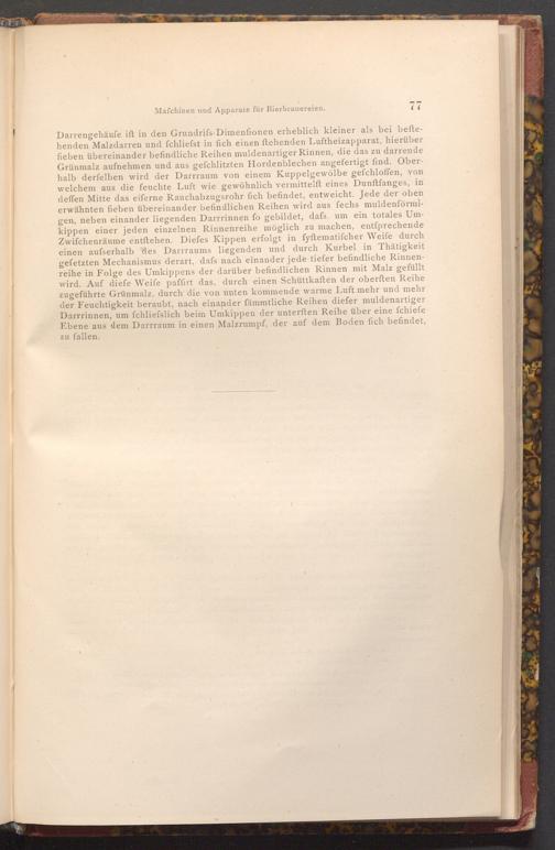 Darrengehäufe ift in den Grundrifs Dimenfionen erheblich kleiner als bei beftehenden Malzdarren und fchliefst in fich einen ftehenden Luftheizapparat, hierüber fieben übereinander befindliche Reihen muldenartiger Rinnen, die das zu darrende Grünmalz aufnehmen und aus gefchlitzten Hordenblechen angefertigt find. Oberhalb derfelben wird der Darrraum von einem Kuppelgewölbe gefchloffen, von welchem aus die feuchte Luft wie gewöhnlich vermittelft eines Dunftfanges, in deffen Mitte das eiferne Rauchabzugsrohr fich befindet, entweicht. Jede der oben erwähnten fieben übereinander befindlichen Reihen wird aus fechs muldenförmigen, neben einander liegenden Darrrinnen fo gebildet, dafs, um ein totales Umkippen einer jeden einzelnen Rinnenreihe möglich zu machen, entſprechende Zwifchenräume entſtehen. Diefes Kippen erfolgt in fyftematifcher Weife durch einen aufserhalb des Darrraums liegenden und durch Kurbel in Thätigkeit gefetzten Mechanismus derart, dafs nach einander jede tiefer befindliche Rinnenreihe in Folge des Umkippens der darüber befindlichen Rinnen mit Malz gefüllt wird. Auf diefe Weife paffirt das, durch einen Schüttkaften der oberften Reihe zugeführte Grünmalz, durch die von unten kommende warme Luft mehr und mehr der Feuchtigkeit beraubt, nach einander fämmtliche Reihen diefer muldenartiger Darrrinnen, um fchliefslich beim Umkippen der unterften Reihe über eine ſchiefe Ebene aus dem Darrraum in einen Malzrumpf, der auf dem Boden fich befindet, zu fallen.
