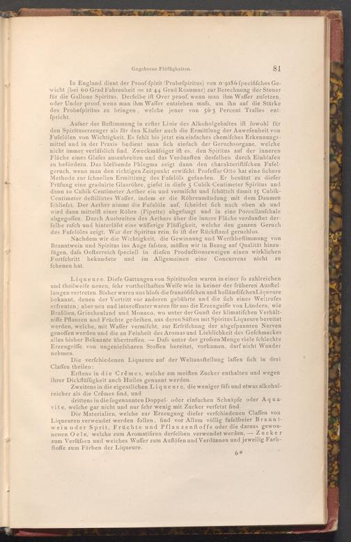 Liqueure. Diefe Gattungen von Spirituofen waren in einer fo zahlreichen und theilweife neuen, fehr vortheilhaften Weife wie in keiner der früheren Ausftellungen vertreten. Bisher waren uns blofs die franzöfifchen und holländifchen Liqueure. bekannt, denen der Vortritt vor anderen gebührte und die fich eines Weltrufes erfreuten; aber neu und intereffanter waren für uns die Erzeugniffe von Ländern, wie Brafilien, Griechenland und Monaco, wo unter der Gunft der klimatifchen Verhältniffe Pflanzen und Früchte gedeihen, aus deren Säften mit Spiritus Liqueure bereitet werden, welche, mit Waffer vermifcht, zur Erfrischung der abgefpannten Nerven genoffen werden und die an Feinheit des Aromas und Lieblichkeit des Gefchmackes alles bisher Bekannte übertreffen. Dafs unter der grofsen Menge viele fchlechte Erzeugniffe, von ungeniefsbaren Stoffen bereitet, vorkamen, darf nicht Wunder nehmen.