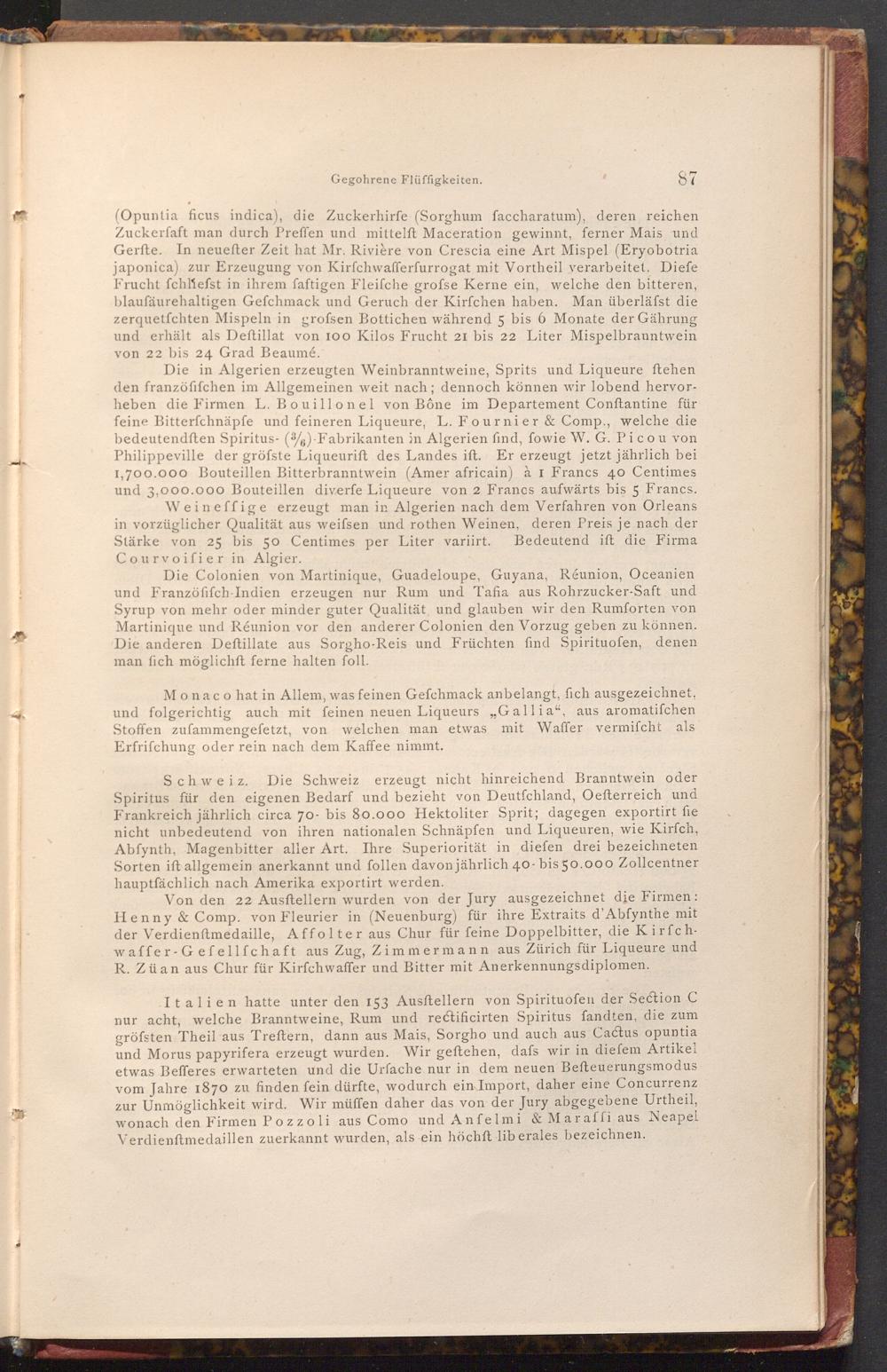 Die in Algerien erzeugten Weinbranntweine, Sprits und Liqueure ſtehen den franzöfifchen im Allgemeinen weit nach; dennoch können wir lobend hervorheben die Firmen L. Bouillonel von Bône im Departement Conftantine für feine Bitterfchnäpfe und feineren Liqueure, L. Fournier& Comp., welche die bedeutendften Spiritus-( 3/6)-Fabrikanten in Algerien find, fowie W. G. Picou von Philippeville der gröfste Liqueurift des Landes ift. Er erzeugt jetzt jährlich bei 1,700.000 Bouteillen Bitterbranntwein( Amer africain) à I Francs 40 Centimes. und 3,000.000 Bouteillen diverfe Liqueure von 2 Francs aufwärts bis 5 Francs. Weineffige erzeugt man in Algerien nach dem Verfahren von Orleans in vorzüglicher Qualität aus weifsen und rothen Weinen, deren Preis je nach der Stärke von 25 bis 50 Centimes per Liter variirt. Bedeutend ift die Firma Courvoifier in Algier.