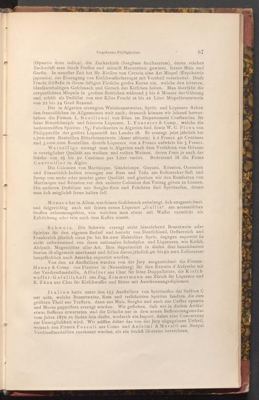 Von den 22 Ausftellern wurden von der Jury ausgezeichnet die Firmen: Henny& Comp. von Fleurier in( Neuenburg) für ihre Extraits d'Abfynthe mit der Verdienftmedaille, Affolter aus Chur für feine Doppelbitter, die Kirfchwaffer Gefellfchaft aus Zug, Zimmermann aus Zürich für Liqueure und R. Züan aus Chur für Kirfchwaffer und Bitter mit Anerkennungsdiplomen.