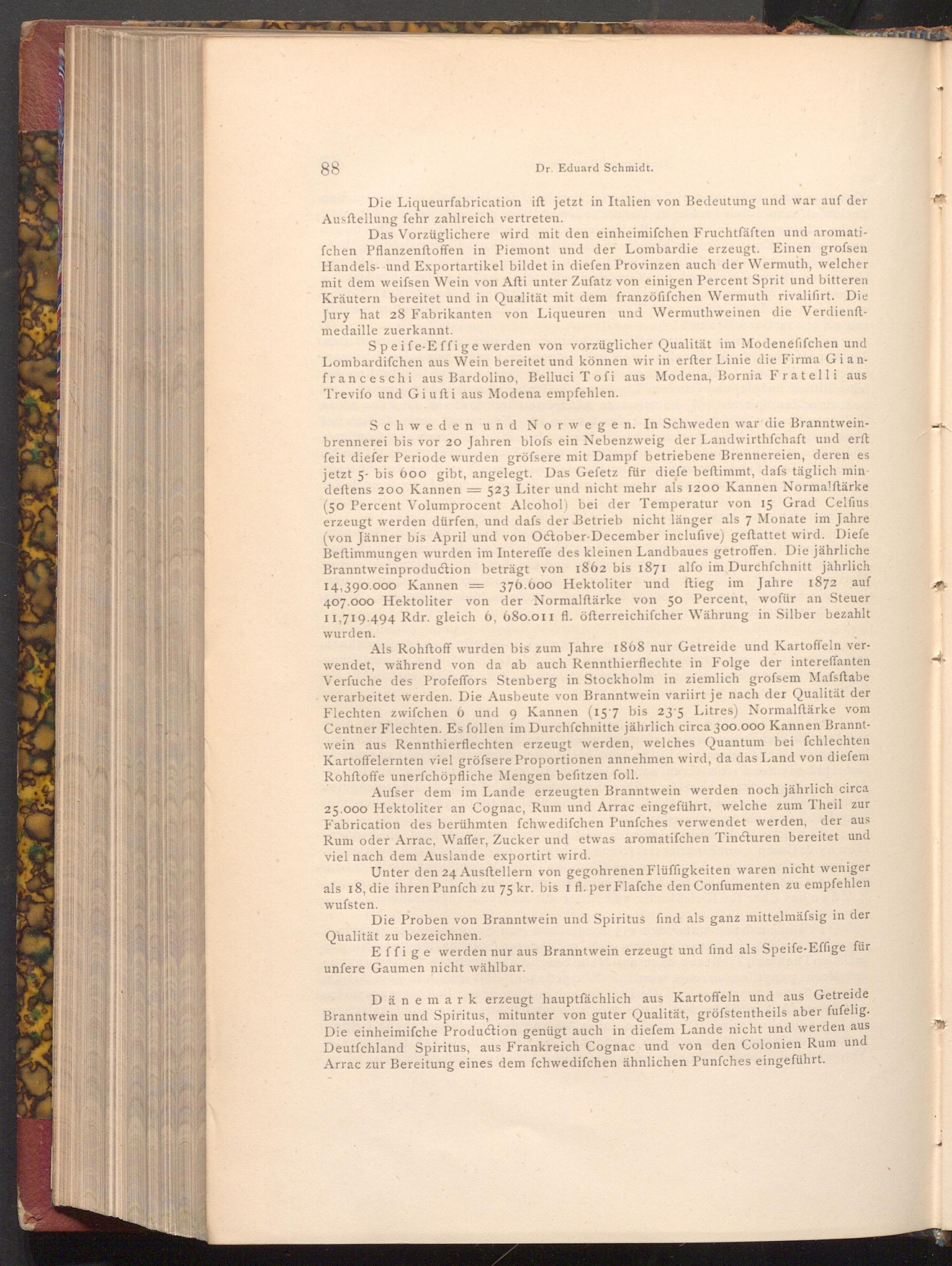Schweden und Norwegen. In Schweden war die Branntweinbrennerei bis vor 20 Jahren blofs ein Nebenzweig der Landwirthschaft und erft feit diefer Periode wurden gröfsere mit Dampf betriebene Brennereien, deren es jetzt 5- bis 600 gibt, angelegt. Das Gefetz für dieſe beſtimmt, dafs täglich mindeftens 200 Kannen 523 Liter und nicht mehr als 1200 Kannen Normalftärke ( 50 Percent Volumprocent Alcohol) bei der Temperatur von 15 Grad Celfius erzeugt werden dürfen, und dafs der Betrieb nicht länger als 7 Monate im Jahre ( von Jänner bis April und von October- December inclufive) geftattet wird. Diefe Beftimmungen wurden im Intereffe des kleinen Landbaues getroffen. Die jährliche Branntweinproduction beträgt von 1862 bis 1871 alfo im Durchfchnitt jährlich 14.390.000 Kannen= 376.600 Hektoliter und ftieg im Jahre 1872 auf 407.000 Hektoliter von der Normalftärke von 50 Percent, wofür an Steuer 11,719.494 Rdr. gleich 6, 680.011 fl. öfterreichifcher Währung in Silber bezahlt