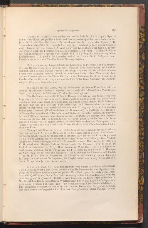 Von 25 Ausftellern wurde eine reiche Auswahl an feinen Liqueuren, Genèvre, Spiritus und auch Arrac und Rum aus ihren Colonien hieher gefandt. Der Vortritt vor Allem gebührt wohl der rühmlichft bekannten, 200 Jahre alten Firma Wynand Focking in Amfterdam, welche für ihre feinen Liqueure auf allen grofsen Ausftellungen mit Auszeichnungen erfter Claffe prämiirt wurde. Hier wurde ihr blofs die V. M. zuerkannt. Grofses Lob verdienen auch die Firmen Catz& Sohn zu Pechel in Friesland A. J. Hoffmann zu Woerden L. Bols Erben zu