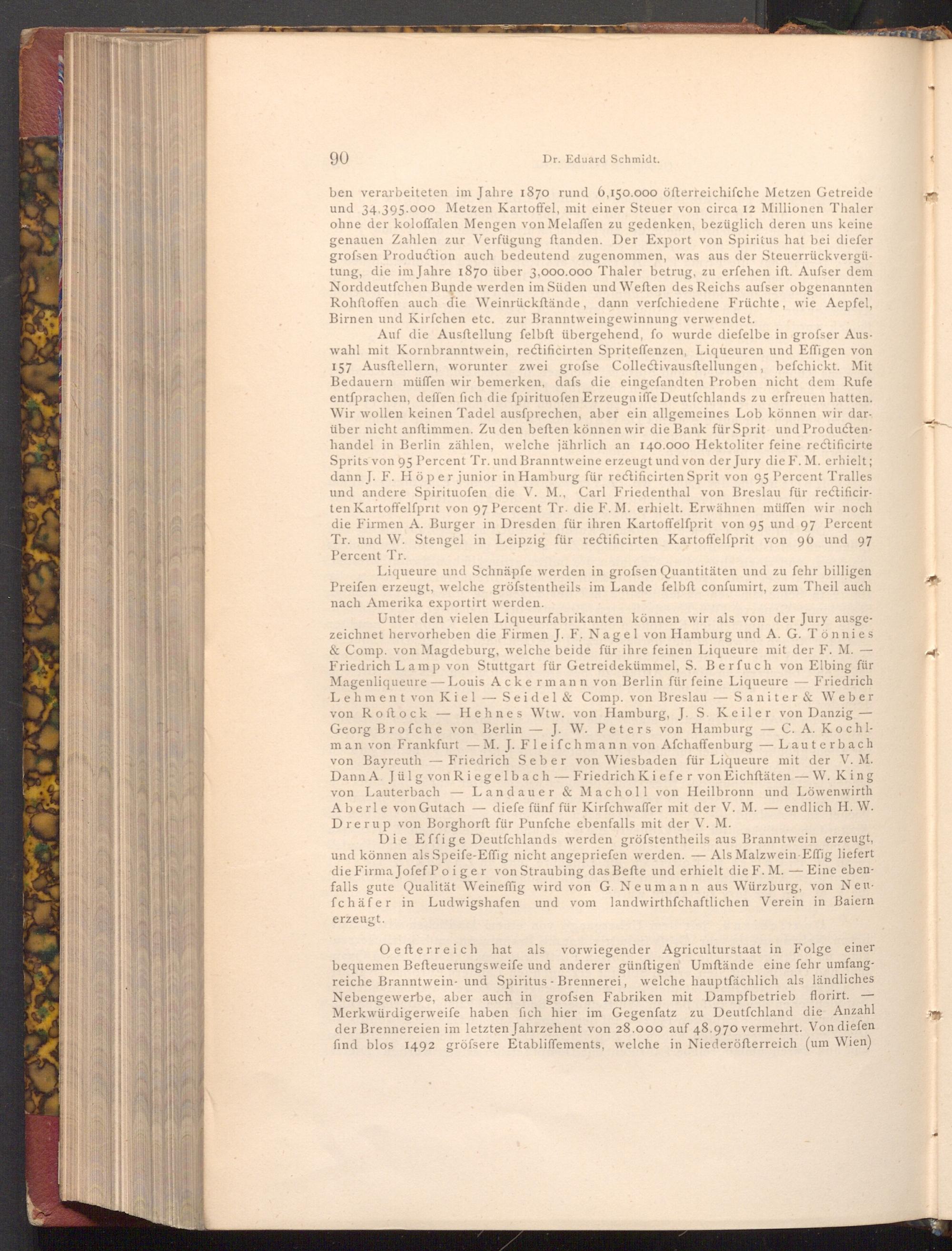 Auf die Ausftellung felbft übergehend, fo wurde diefelbe in grofser Auswahl mit Kornbranntwein, rectificirten Spriteffenzen, Liqueuren und Effigen von 157 Ausftellern, worunter zwei grofse Collectivausftellungen, befchickt. Mit Bedauern müffen wir bemerken, dafs die eingefandten Proben nicht dem Rufe entſprachen, deffen fich die fpirituofen Erzeugniffe Deutſchlands zu erfreuen hatten. Wir wollen keinen Tadel ausfprechen, aber ein allgemeines Lob können wir darüber nicht anftimmen. Zu den beften können wir die Bank für Sprit und Productenhandel in Berlin zählen, welche jährlich an 140.000 Hektoliter feine rectificirte Sprits von 95 Percent Tr. und Branntweine erzeugt und von der Jury die F. M. erhielt; dann J. F. Höper junior in Hamburg für rectificirten Sprit von 95 Percent Tralles und andere Spirituofen die V. M., Carl Friedenthal von Breslau für rectificirten Kartoffelfprit von 97 Percent Tr. die F. M. erhielt. Erwähnen müffen wir noch die Firmen A. Burger in Dresden für ihren Kartoffelfprit von 95 und 97 Percent Tr. und W. Stengel in Leipzig für rectificirten Kartoffelfprit von 96 und 97 Percent Tr.