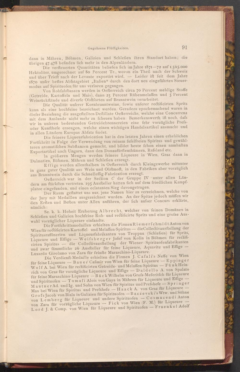 und Spirituofen- Tomafi Alois von Gaya in Mähren für Liqueure und Effige- Mautner Ad. und Ig. und Sohn von Wien für Spiritus und Prefshefe- Springer Max bei Wien für Spiritus und Prefshefe Haack A. von Graz für Liqueure Grofs Jacob von Biala in Galizien für Spirituofen- Baczevski's Wtw. und Söhne von Lemberg für Liqueure und andere Spirituofen Cosmacendi Anton von Zara für vorzügliche Liqueure- Fick von Wien( F. M.) für Liqueure Lord J.& Comp. von Wien für Liqueure und Spirituofen- Fraenkel Adolf