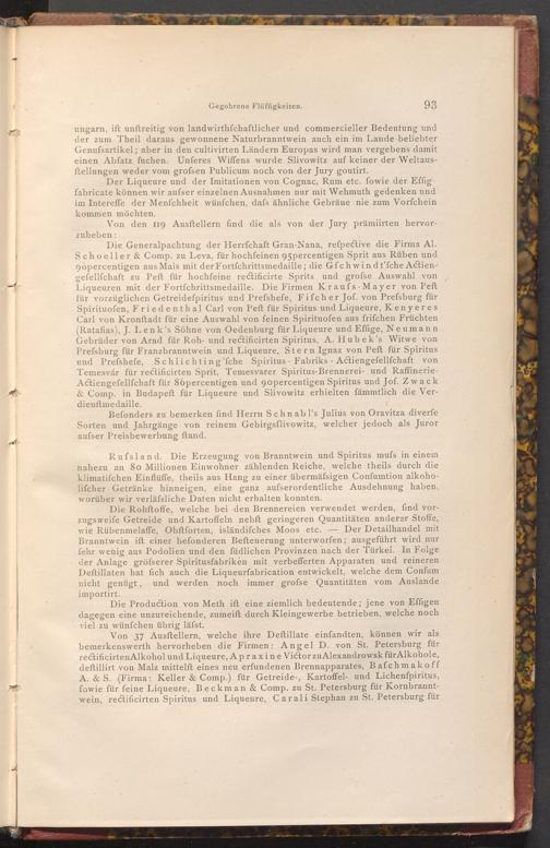 Die Generalpachtung der Herrfchaft Gran- Nana, refpective die Firma Al. Schoeller& Comp. zu Leva, für hochfeinen 95percentigen Sprit aus Rüben und 90percentigen aus Mais mit der Fortfchrittsmedaille; die Gfchwind t'fche Actiengefellfchaft zu Peft für hochfeine rectificirte Sprits und grofse Auswahl von Liqueuren mit der Fortfchrittsmedaille. Die Firmen Kraufs Mayer von Peft. für vorzüglichen Getreidefpiritus und Prefshefe, Fifcher Jof. von Prefsburg für Spirituofen, Friedenthal Carl von Peft für Spiritus und Liqueure, Kenyeres Carl von Kronftadt für eine Auswahl von feinen Spirituofen aus frifchen Früchten ( Ratafias), J. Lenk's Söhne von Oedenburg für Liqueure und Effige, Neumann Gebrüder von Arad für Roh- und rectificirten Spiritus, A. Hubek's Witwe von Prefsburg für Franzbranntwein und Liqueure, Stern Ignaz von Peft für Spiritus und Prefshefe, Schlichting' fche Spiritus Fabriks Actiengeſellſchaft von Temesvár für rectificirten Sprit, Temesvarer Spiritus- Brennerei- und RaffinerieActiengefellſchaft für 86 percentigen und 90percentigen Spiritus und Jof. Zwack & Comp. in Budapeft für Liqueure und Slivowitz erhielten fämmtlich die Verdienftmedaille.