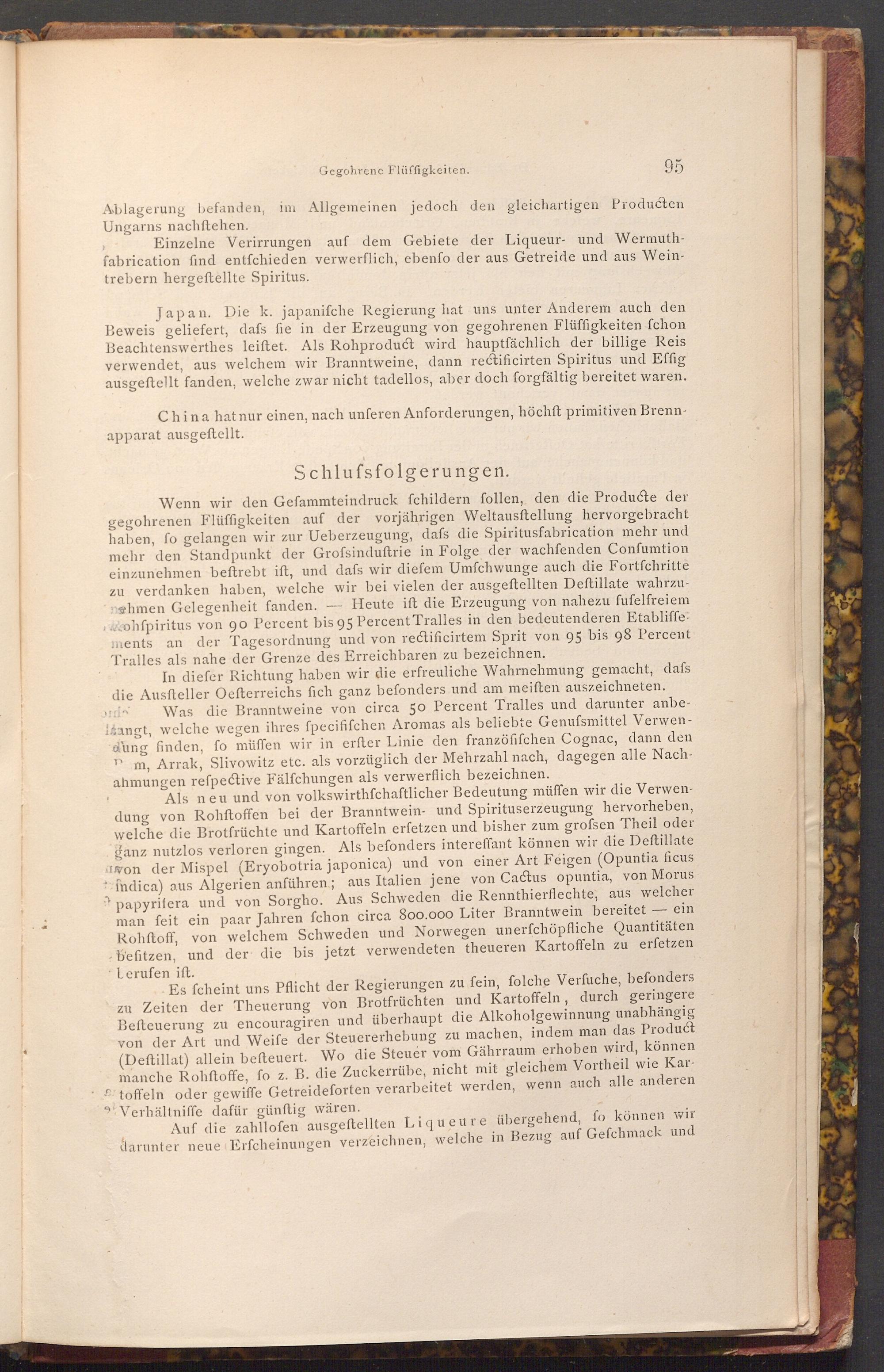 Wenn wir den Gefammteindruck fchildern follen, den die Producte der gegohrenen Flüffigkeiten auf der vorjährigen Weltausftellung hervorgebracht haben, fo gelangen wir zur Ueberzeugung, dafs die Spiritusfabrication mehr und mehr den Standpunkt der Grofsinduftrie in Folge der wachfenden Confumtion einzunehmen beftrebt ift, und dafs wir diefem Umfchwunge auch die Fortfchritte zu verdanken haben, welche wir bei vielen der ausgeftellten Deftillate wahrzunehmen Gelegenheit fanden. Heute ift die Erzeugung von nahezu fufelfreiem Wohfpiritus von 90 Percent bis 95 Percent Tralles in den bedeutenderen Etabliffements an der Tagesordnung und von rectificirtem Sprit von 95 bis 98 Percent Tralles als nahe der Grenze des Erreichbaren zu bezeichnen.