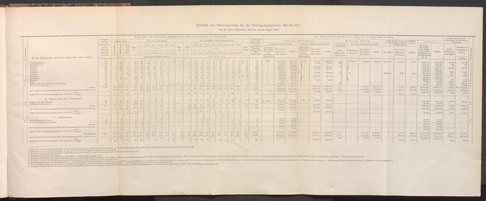 6) Nebft dem Steuerfatze ift noch ein Zufchlagsbetrag zu berechnen und einzuheben für Wien 1 fl. kr. von jedem erzeugten niederöfterreichiſchen Eimer zu 422 Wiener Mafs; dagegen für Prag, Brünn, Linz, Graz, Laibach, Lemberg und Krakau von jedem Saccharometergrade 410 Neukreuzer einfchliesslich des aufserordentlichen Zufchlages. Gefetz vom 25. April 1869. 8) Aufser Betrieb waren in Niederösterreich 13, in Oberösterreich 26, in Salzburg 1, in Böhmen 78, in Mähren 34, in Schlefien 16, in Galizien 14, in der Bukowina 5, in Steiermark 11, in Kärnten 28, in Krain 6, in Tirol und Vorarlberg ro, in Ungarn und Siebenbürgen 105, in Croatien fammt Slavonien 7, zufammen 354 Brauereien. Der Ertrag fcheint bei den Pachtungen einbezogen.