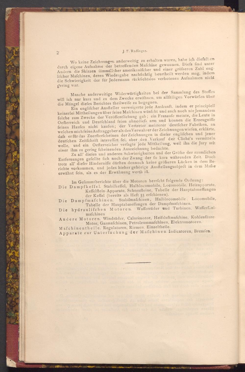 Im Gefammtberichte über die Motoren herrfcht folgende Ordnung: Die Dampfkeffel. Stabilkeffel, Halblocomobile, Locomobile, Heizapparate, Keffelftein Apparate, Schornfteine, Tabelle der Hauptabmeffungen der Keffel( bereits als Heft 55 erſchienen).