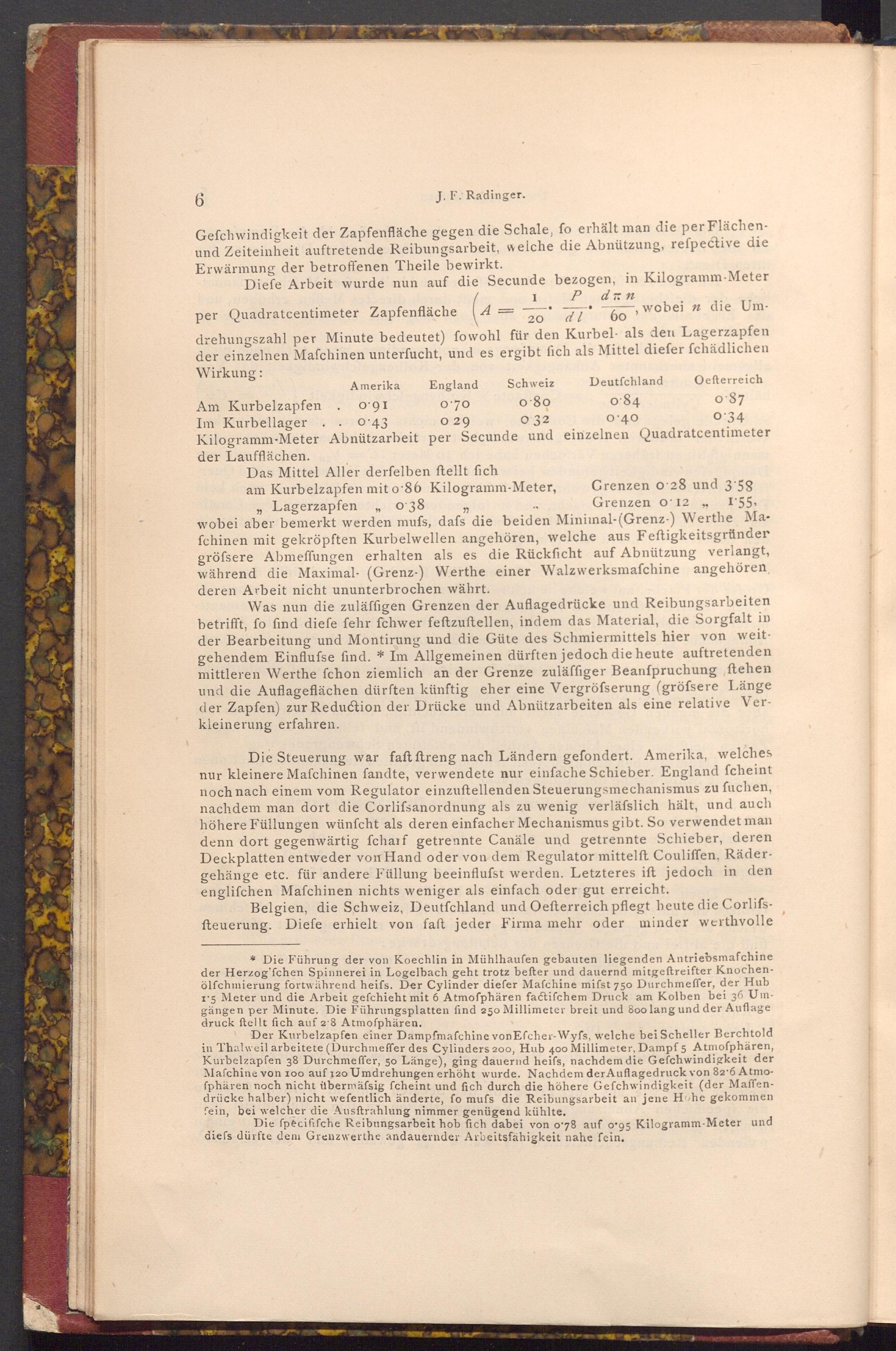 Was nun die zuläffigen Grenzen der Auflagedrücke und Reibungsarbeiten betrifft, fo find diefe fehr fchwer feftzuftellen, indem das Material, die Sorgfalt in der Bearbeitung und Montirung und die Güte des Schmiermittels hier von weitgehendem Einflufse find.* Im Allgemeinen dürften jedoch die heute auftretenden mittleren Werthe fchon ziemlich an der Grenze zuläffiger Beanfpruchung ftehen und die Auflageflächen dürften künftig eher eine Vergröfserung( gröfsere Länge der Zapfen) zur Reduction der Drücke und Abnützarbeiten als eine relative Verkleinerung erfahren.