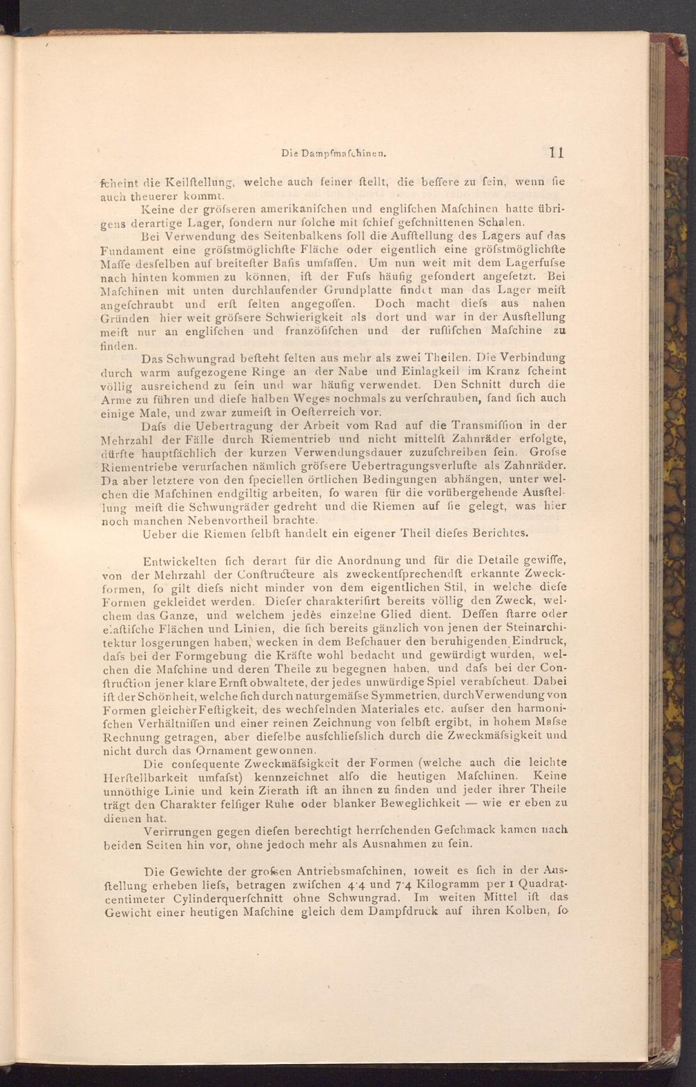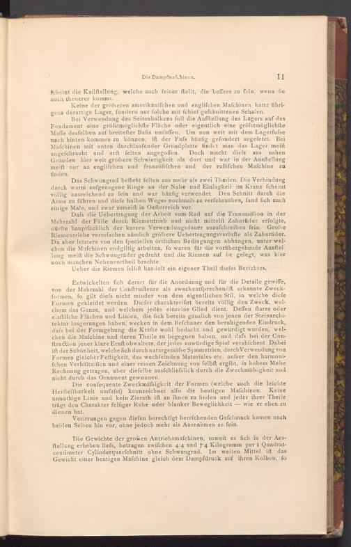 Die confequente Zweckmäfsigkeit der Formen( welche auch die leichte Herftellbarkeit umfafst) kennzeichnet alfo die heutigen Mafchinen. Keine unnöthige Linie und kein Zierath ift an ihnen zu finden und jeder ihrer Theile wie er eben zu trägt den Charakter felfiger Ruhe oder blanker Beweglichkeit