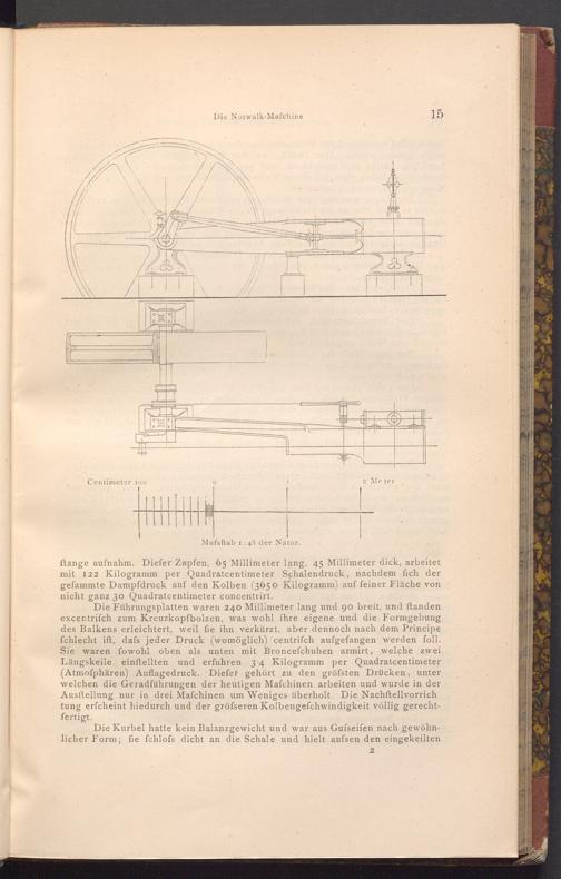 Die Führungsplatten waren 240 Millimeter lang und 90 breit, und ftanden excentrisch zum Kreuzkopfbolzen, was wohl ihre eigene und die Formgebung des Balkens erleichtert, weil fie ihn verkürzt, aber dennoch nach dem Principe fchlecht ift, dafs jeder Druck( womöglich) centrifch aufgefangen werden foll. Sie waren fowohl oben als unten mit Broncefchuhen armirt, welche zwei Längskeile einftellten und erfuhren 34 Kilogramm per Quadratcentimeter ( Atmosphären) Auflagedruck. Diefer gehört zu den gröfsten Drücken, unter welchen die Geradführungen der heutigen Maſchinen arbeiten und wurde in der Ausstellung nur in drei Mafchinen um Weniges überholt. Die Nachftellvorrich tung erfcheint hie durch und der gröfseren Kolbengefchwindigkeit völlig gerechtfertigt.