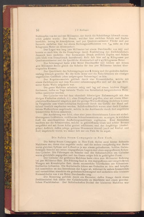 Die Ausführung war folid, ohne aber jenen übertriebenen Luxus mit nickelüberzogenen Griffrädern, verfilberten Schraubenmuttern etc. zu zeigen, in welchem fonft die amerikanifchen Ausftellungsmafchinen erglänzten. Eine Ausnahme machten nur die Schmiervafen, welche in gefchliffenem Glafe und echter Bronce ausgeführt und mit ihrem Adler geziert erfchienen, und der forgfältige( dunkelgrüne) Auftrich, deffen ruhige, goldene Ornamente überall( auch auf Kurbel und Rad) angebracht waren, wo immer fich nur ein Platz für fie ergab.