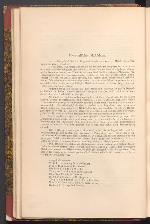 Die grofsen englifchen Ausstellungsmaschinen hatten alle unten durchlaufende Grundplatten und einfach fchiefgefchnittene Lager. Die kleineren Mafchinen waren im Allgemeinen forgfältiger ausgeführt als die grofsen. Hier kamen die einzigen ganz blank polirten Maſchinen und hoffentlich zum letzten Male auf einer Ausftellung vor.