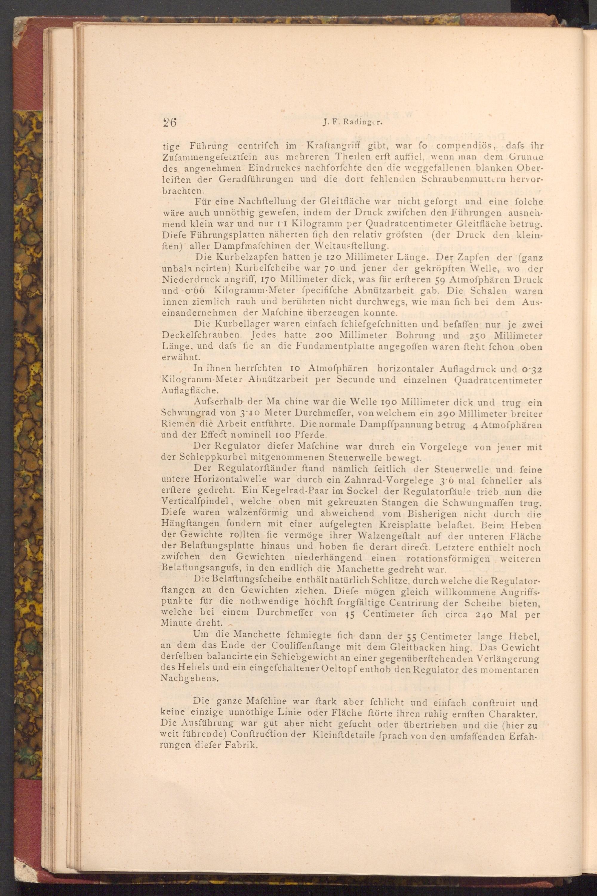 Die ganze Mafchine war ftark aber fchlicht und einfach conftruirt und keine einzige unnöthige Linie oder Fläche ftörte ihren ruhig ernften Charakter. Die Ausführung war gut aber nicht gefucht oder übertrieben und die( hier zu weit führende) Conftruction der Kleinftdetaile fprach von den umfaffenden Erfahrungen diefer Fabrik.